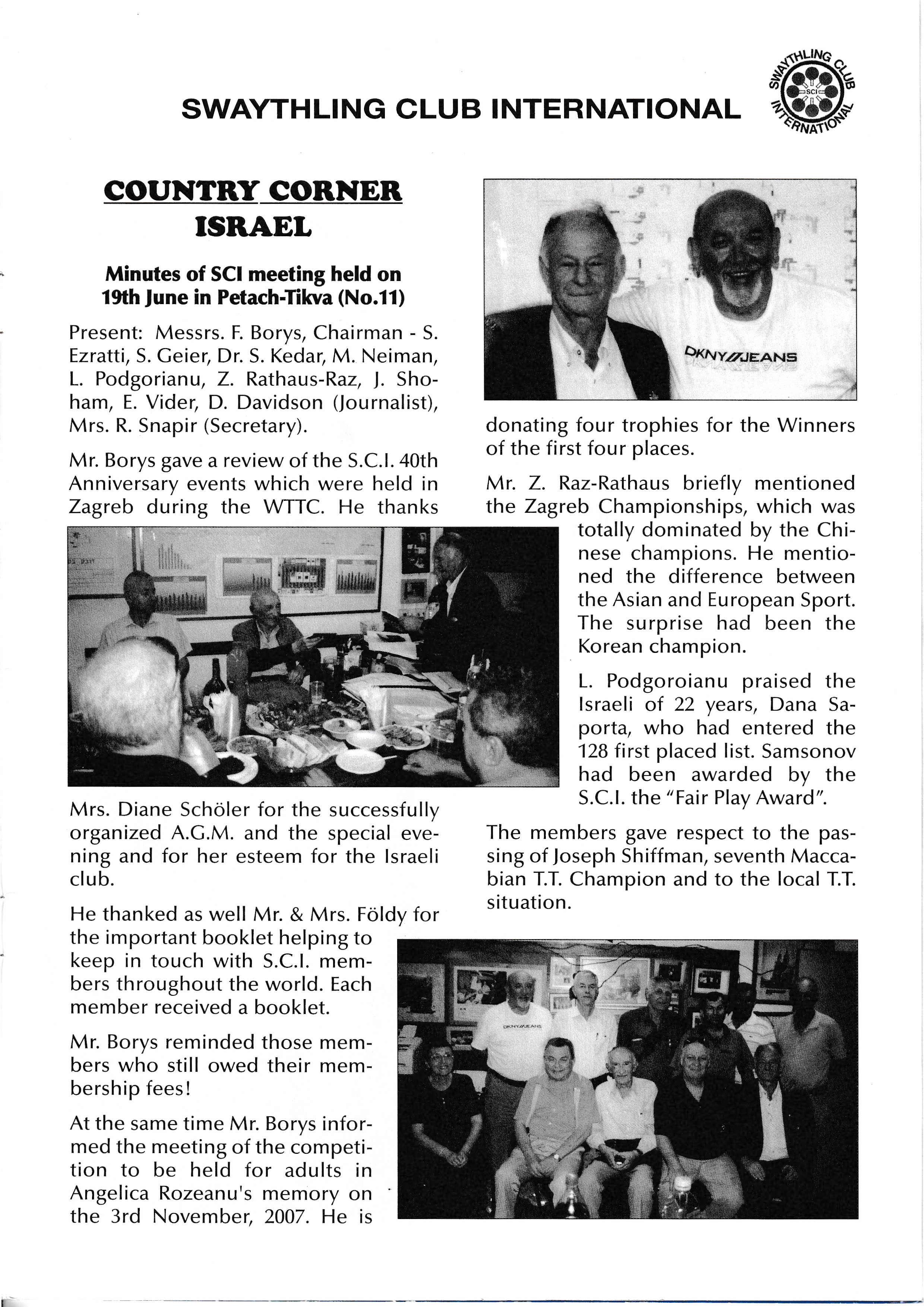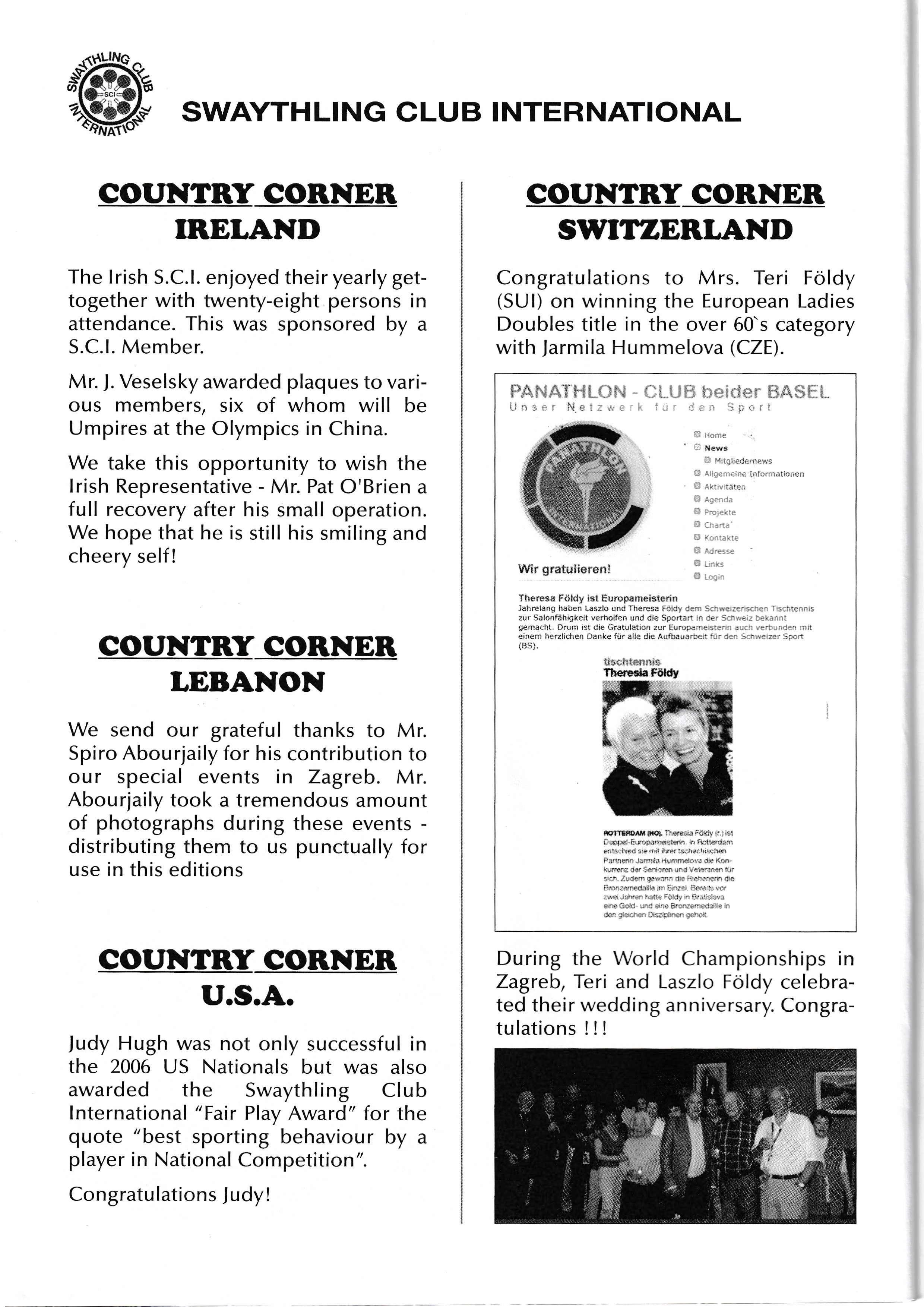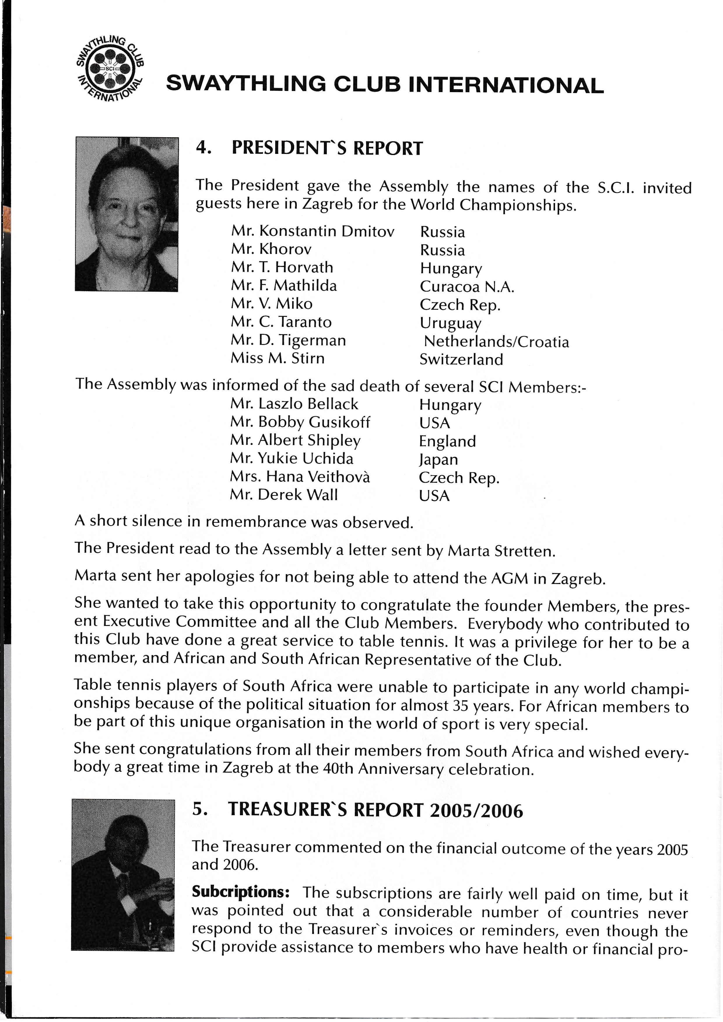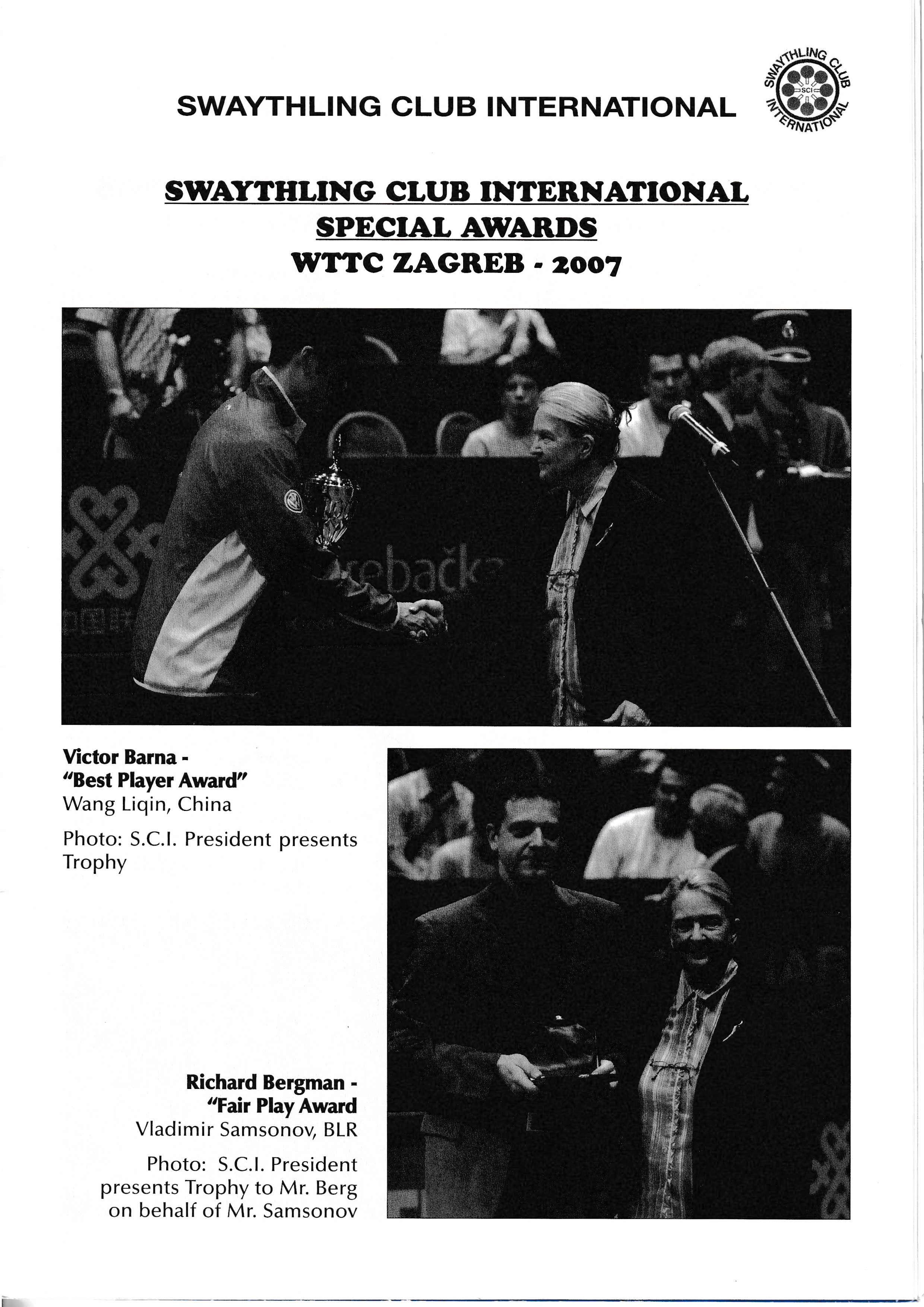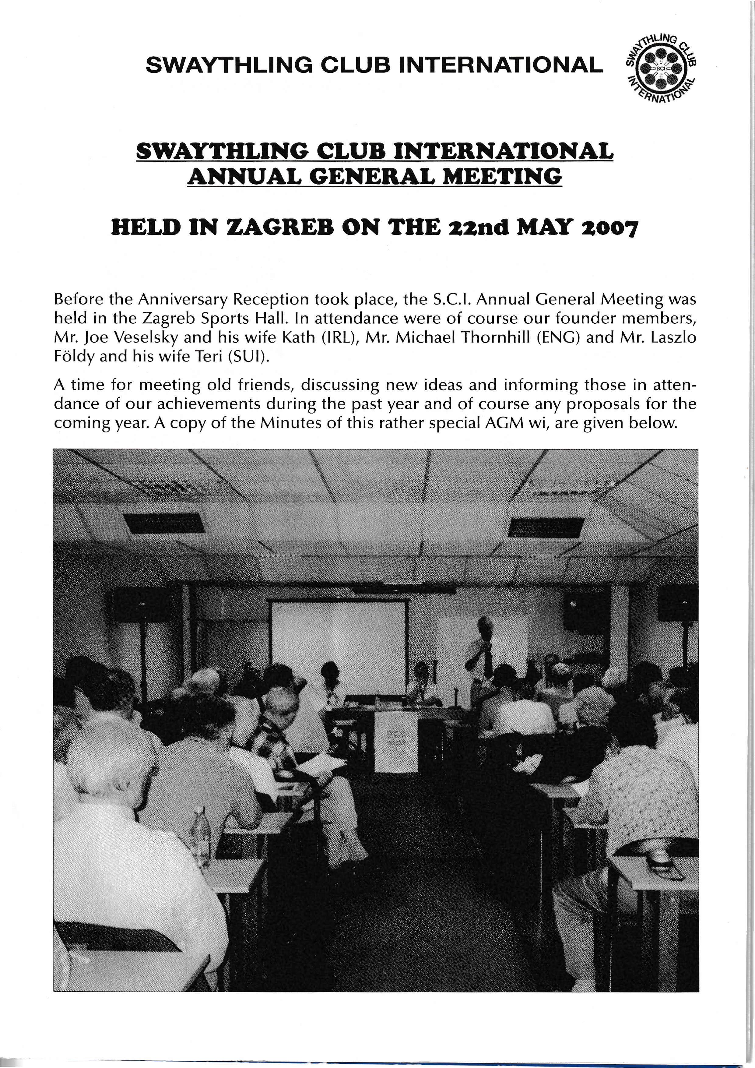 It is with a certain amount of pride and relief when I look back on the World lndividual Championships which were held in Zagreb from the 21st - 27th May,2007. Pride that the Swaythling CIub lnternational has gone from strength to strength during the past forty years.