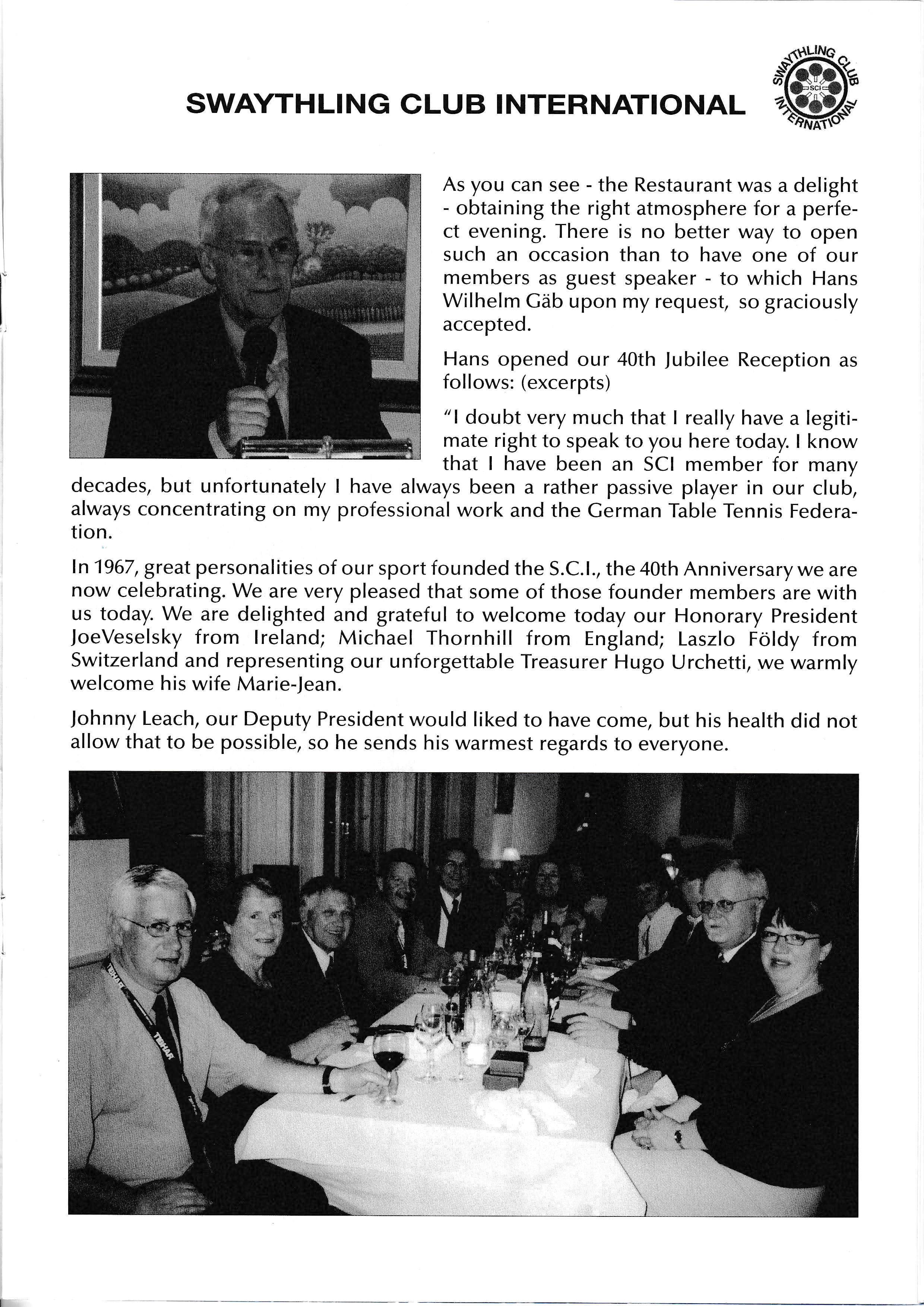 ln1967, great personalities of our sport founded the S.C.l., the 40th Anniversarywe are now celebrating. We are very pleased that some of those founder members are with us today. We are delighted and grateful to welcome today our Honorary President JoeVeselsky from Ireland; Michael Thornhill from England; Laszlo Földy from Switzerland and representing our unforgettable Treasurer Hugo Urchetti, we warmly welcome his wife Marie-Jean.