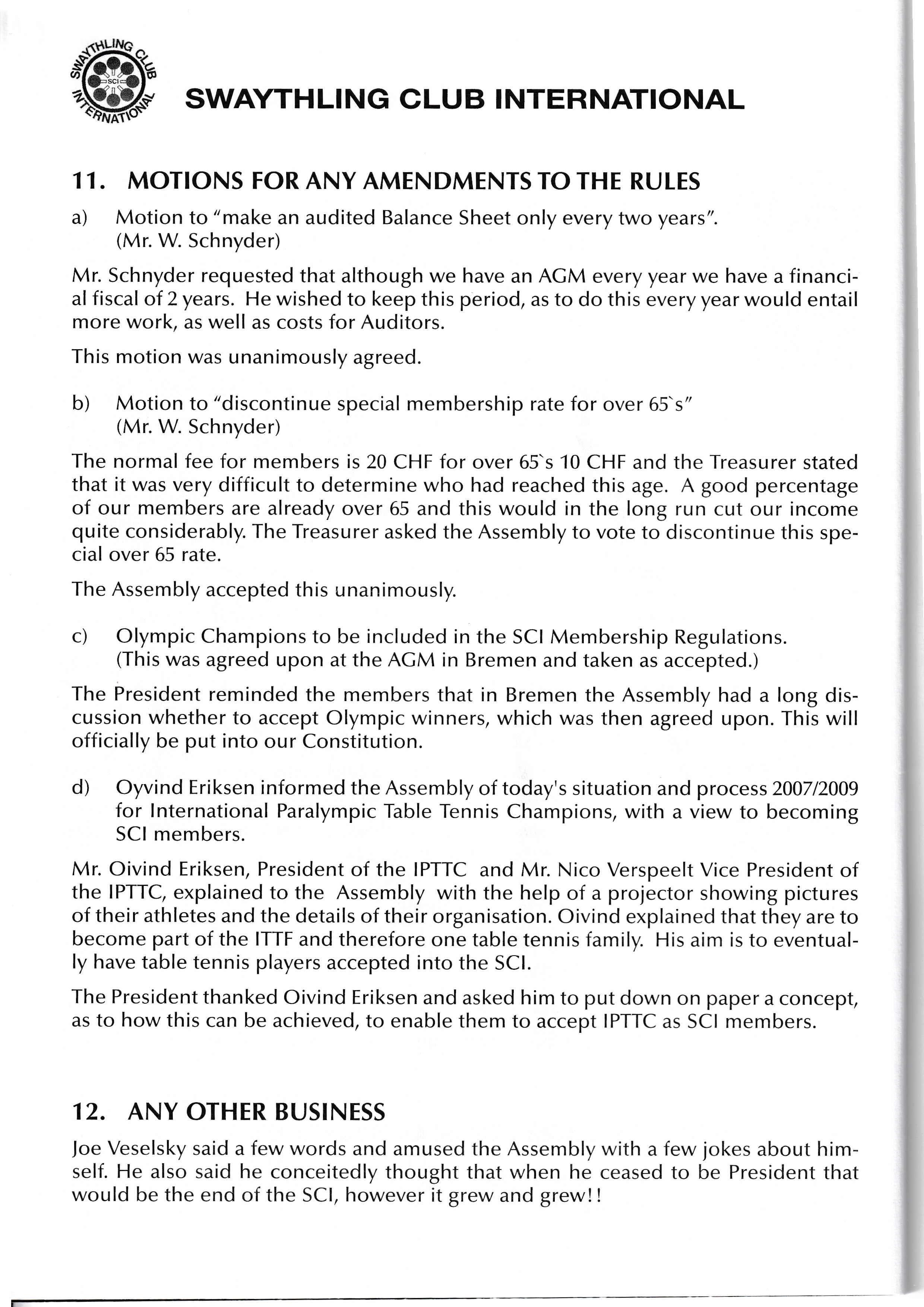 d) Oyvind Eriksen informed the Assembly of today's situation and process200712009 for lnternational Paralympic Table Tennis Champions, with a view to becoming SCI members.