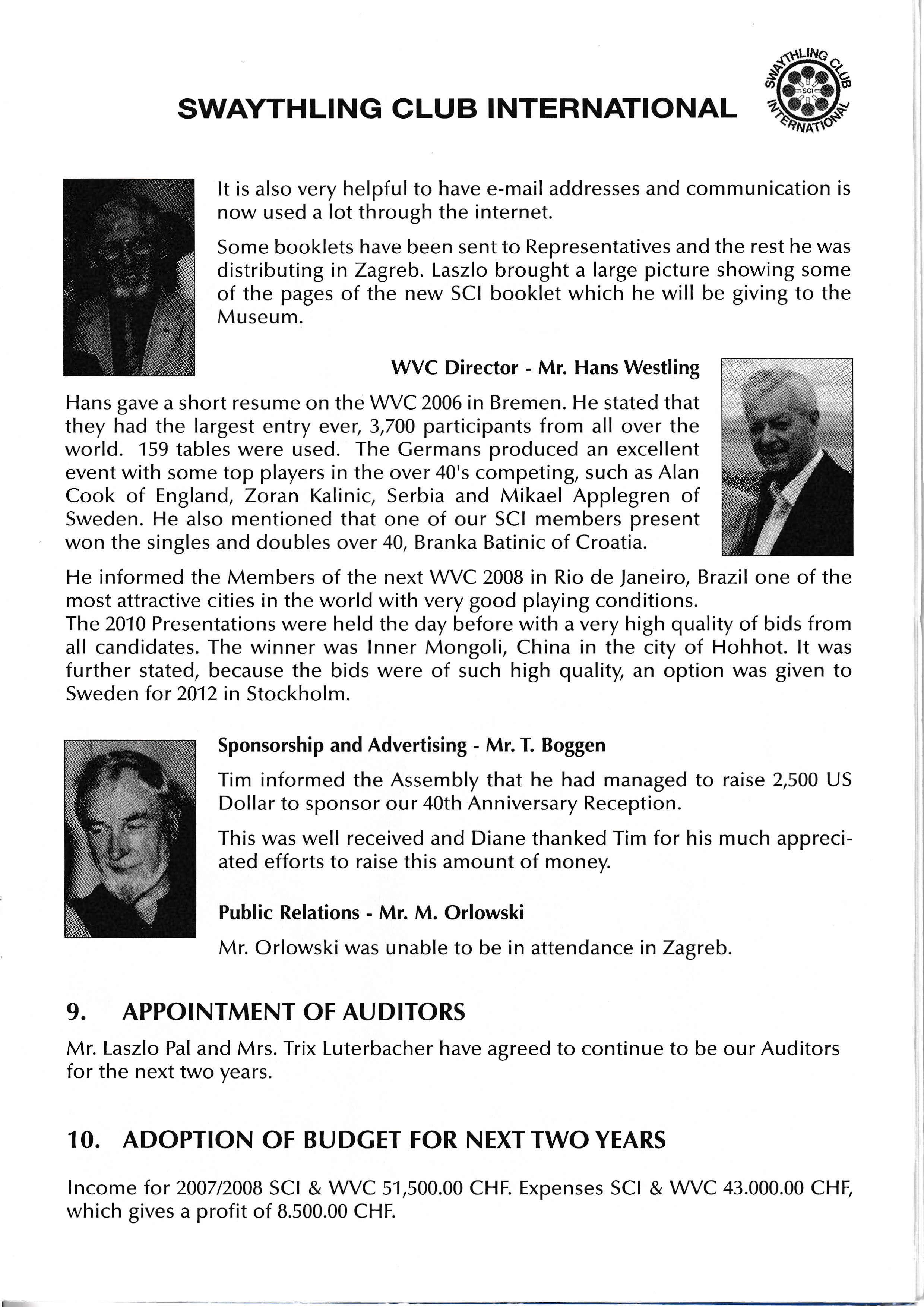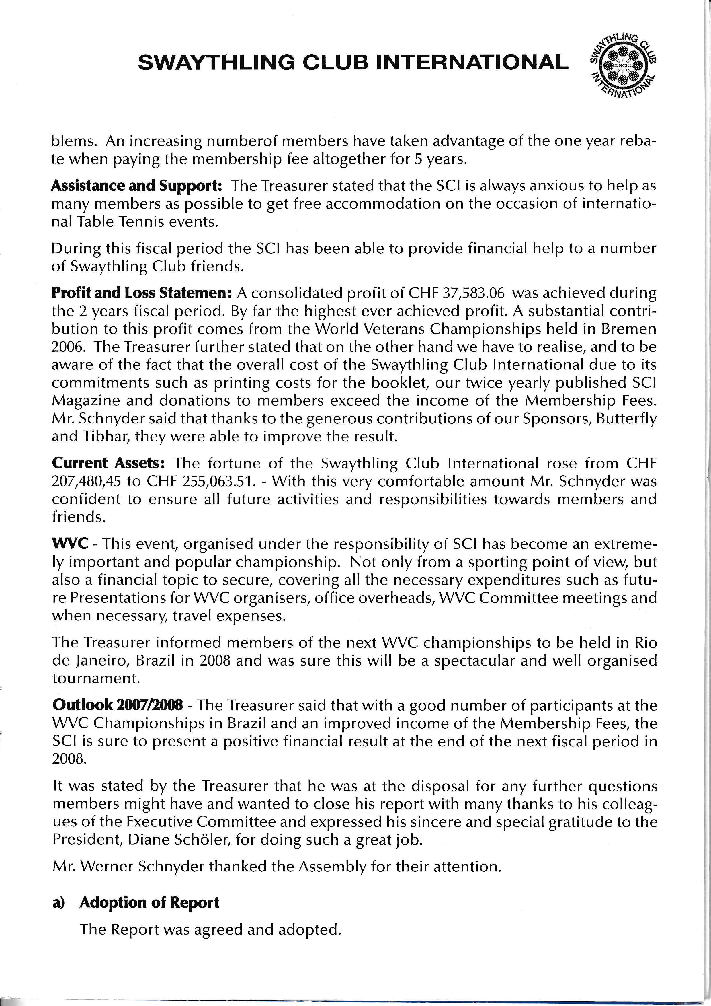 Profitand Loss Statemen: A consolidated profit of CHF 37,583.06 was achieved during the 2 years fiscal period. By far the highest ever achieved profit. A substantial contribution to this profit comes from the World Veterans Championships held in Bremen 2006. The Treasurer further stated that on the other hand we have to realise, and to be aware of the fact that the overall cost of the Swaythling Club International due to its commitments such as printing costs for the booklet, our twice yearly published SCI Magazine and donations to members exceed the income of the Membership Fees. Mr. Schnyder said that thanks to the generous contributions of our Sponsors, Butterfly and Tibhar, they were able to improve the result.
