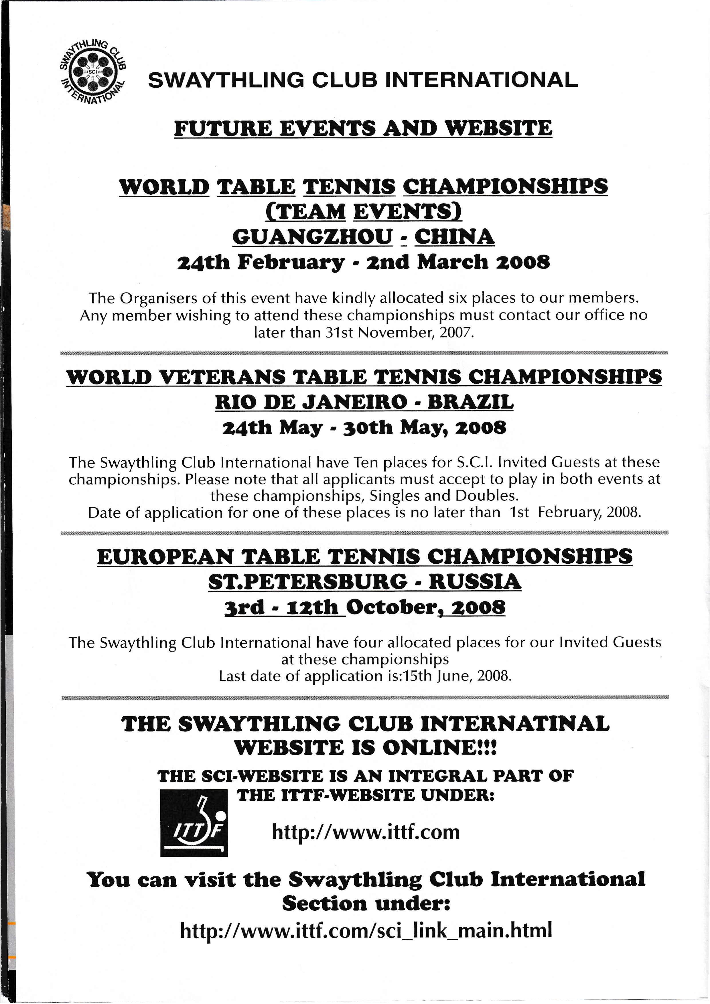 The Swaythling Club lnternational have four allocated places for our lnvited Guests at these championships Last date of application is:15th June, 2008.