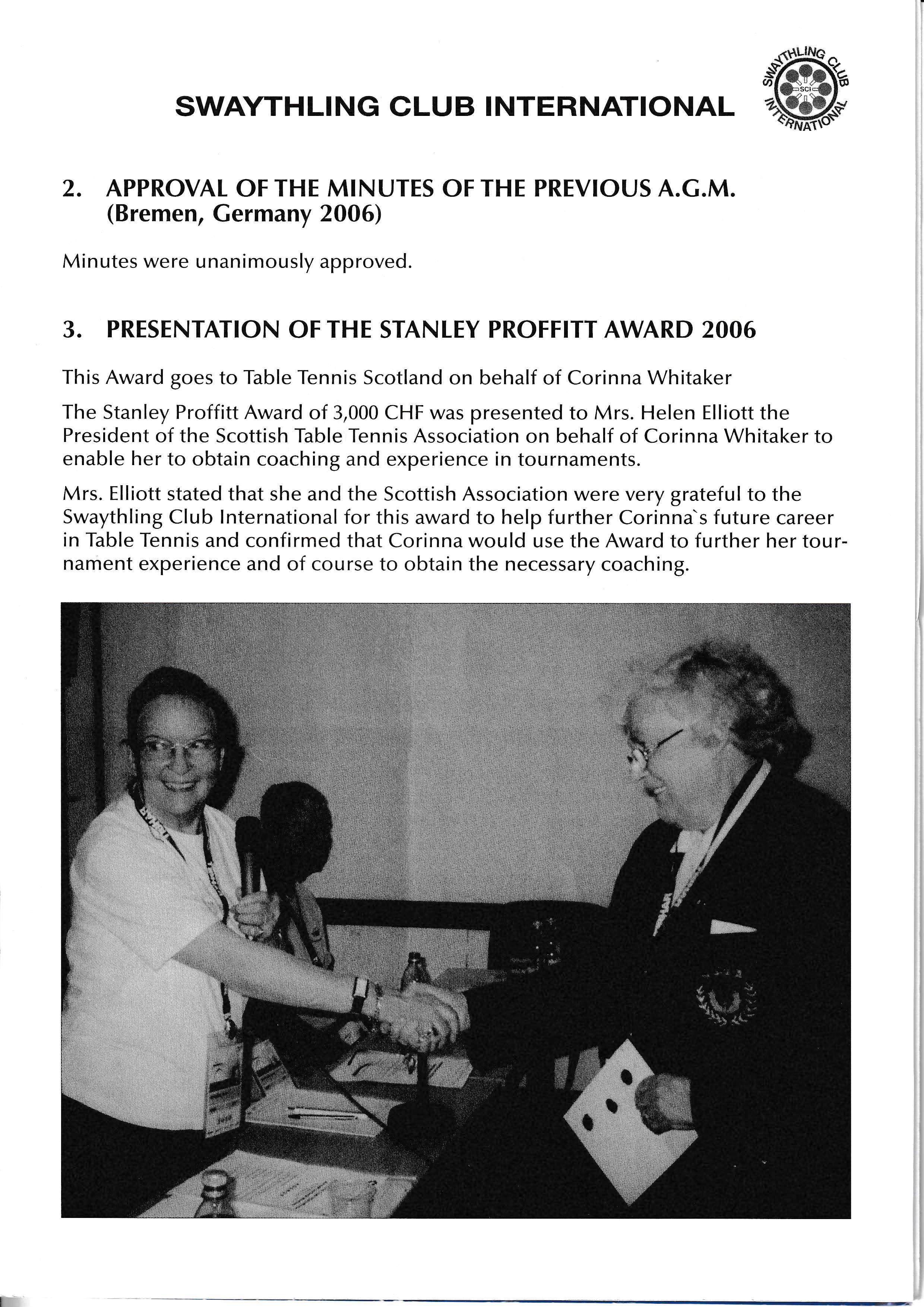 The Stanley Proffitt Award of 3,000 CHF was presented to Mrs. Helen Elliott the President of the Scottish Table Tennis Association on behalf of Corinna Whitaker to enable her to obtain coaching and experience in tournaments.