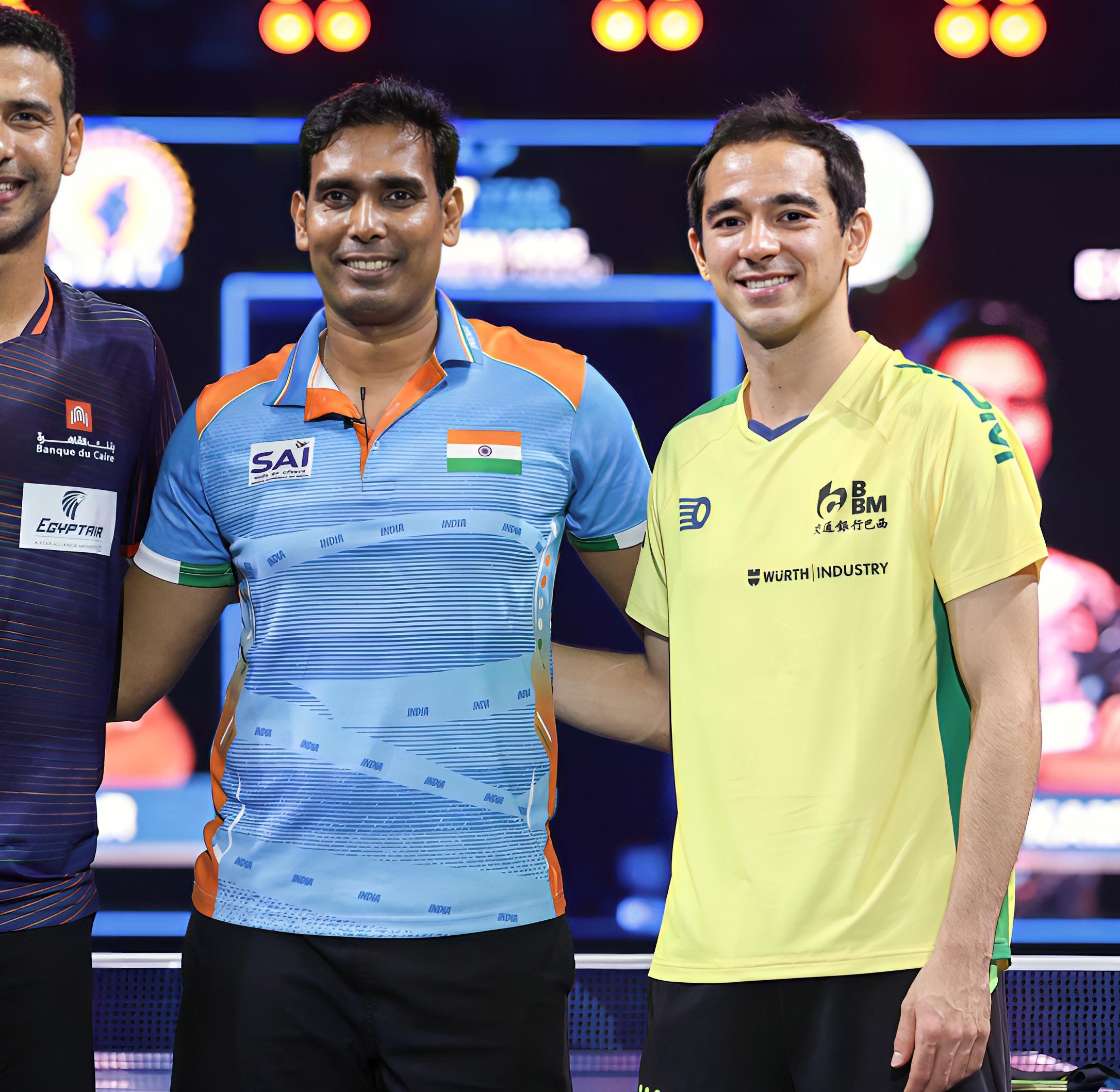 In Chennai Omar Assar left and right Hugo Calderano joined forces with centre Sharath Kamal Achanta to play a series of exhibition matches