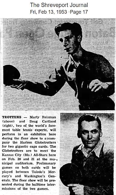 Meanwhile, at age 20, Marty Reisman felt it was time to consider a responsible 9-to-5 job. After brief consideration, his conclusion was No, he was not cut out for that. Luckily, at that moment he had three table tennis offers on the table. From his book The Money Player: “One was an exhibition tour of France; the second for a tour of Sweden. The third was by far the best ... Doug offered me a job as his new partner and I accepted. I accepted immediately.” Reisman devotes Chapter VI of the book to Globetrotter stories. “I had the time of my life.”
