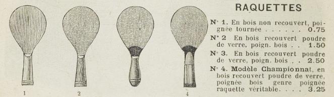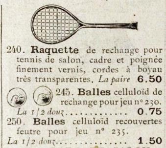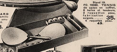 We were able to examine most Manufrance catalogs from 1890 to 1925. Lawn tennis first appeared in the 1899 catalog. Table tennis made its debut in 1902, with vellum rackets (right).