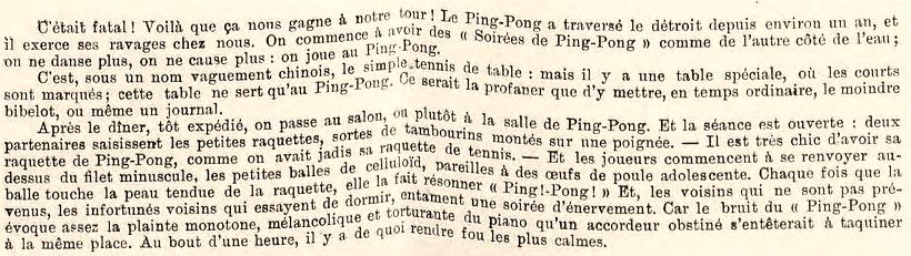 It was fatal! Now it's our turn. Ping-Pong crossed the Channel about a year ago, and it's wreaking havoc on us. We're beginning to have "Plng-Pong Parties" just like on the other side of the water. We no longer dance, we no longer talk: we play Ping-Pong.