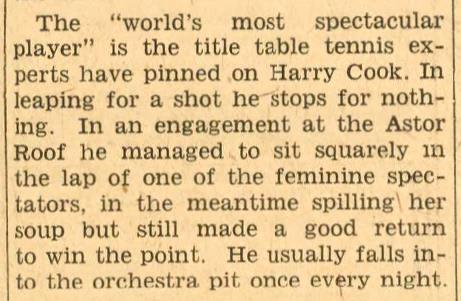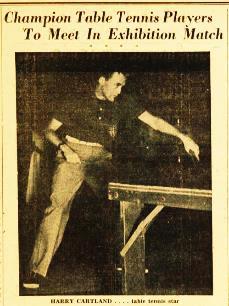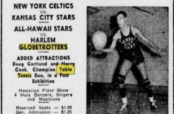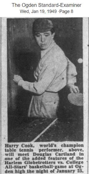 January through April 1948 Doug Cartland and Harry Cook of the U.S. are billed as “America’s No. 1 Comedy Sports Attraction.” The billing is notable because it shows that the Globetrotters basketball team itself still preferred to be known as the world’s best basketball team, which they arguably were in 1948. Cook was the comedian of the 10-minute table tennis performance the guy who, for example, would jump on the table and kick the ball over the net. Cartland and Cook had been doing exhibitions together for years, including a USO (military) tour throughout Europe in 1944-45. Their press notices said Cartland, 33, “graduated from the University of North Carolina with the highest gradepoint average in the school’s history.” More