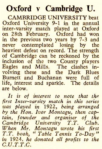 Issue 60 ***Page 13. The table tennis tradition of Oxford vs. Cambridge is related by Gerald Gurney, who attended both universities. We unearth some of Mr. Gurney's personal playing days on page 32 of this issue.