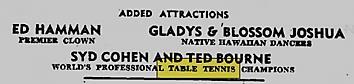 1948-49 Ted Bourne and Syd Cohen are the first table tennis B team, while Cartland/Cook as detailed in previous pages are traveling with the A-squad basketballers. Bourne/Cohen are billed as “foremost contenders for the world pro title,” and later as “world’s professional table tennis champions.” Bourne, 36, was a naturalized U.S. citizen who never lost his Birmingham, England, accent.