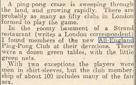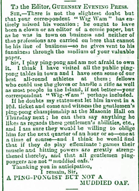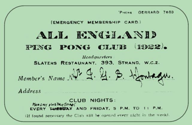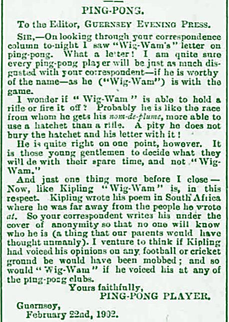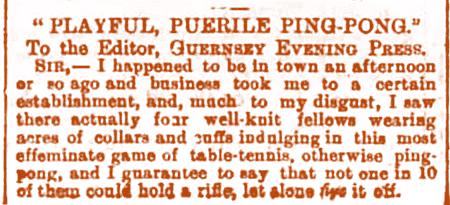 In TT Collector Issue 58, page 12, Gerald Gurney wrote that Ping Pong came to Guernsey, the British island, in 1922. He must have meant that was when the Guernsey TTA was founded, because of course Ping Pong had spread twenty years earlier to all English-speaking countries (and many others).