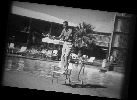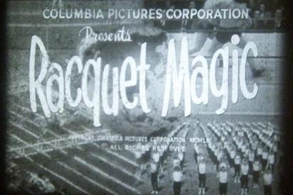 Years later, in movie theaters around the U.S., Ashley starred in an outdoor exhibition filmed in Las Vegas, released in April 1959. He would have been about 27; his two 18-year-old co-stars were the junior champions of the U.S., Lenny Cooperman and Sharon Acton. Veteran sportscaster Bill Stern narrates the ten-minute 16mm film, Racquet Magic, which we recently acquired, digitized and put on YouTube, here