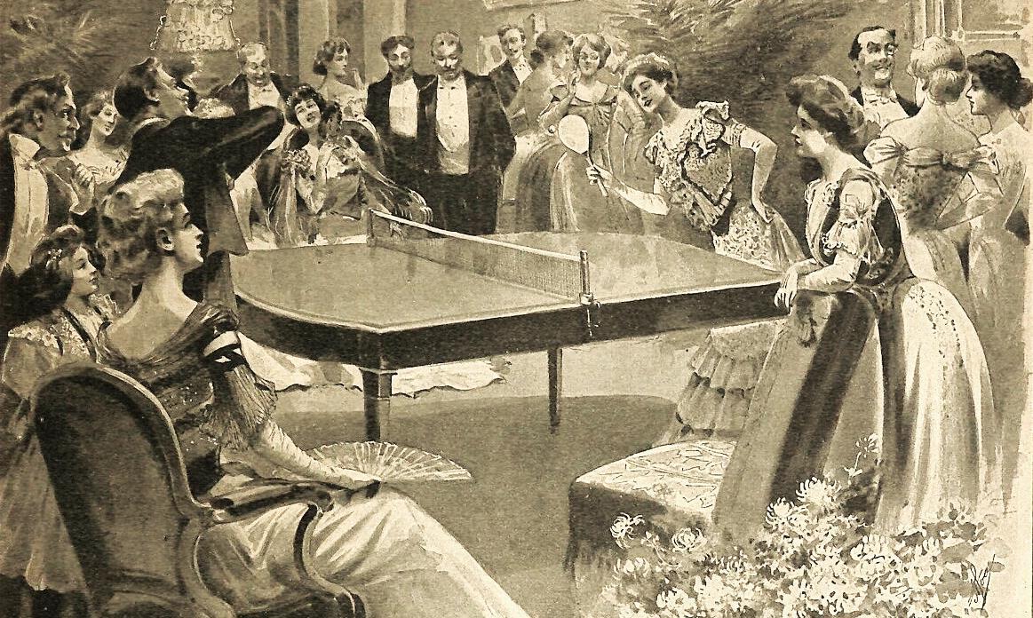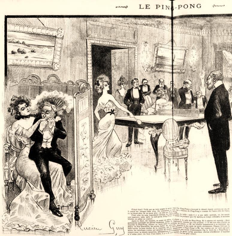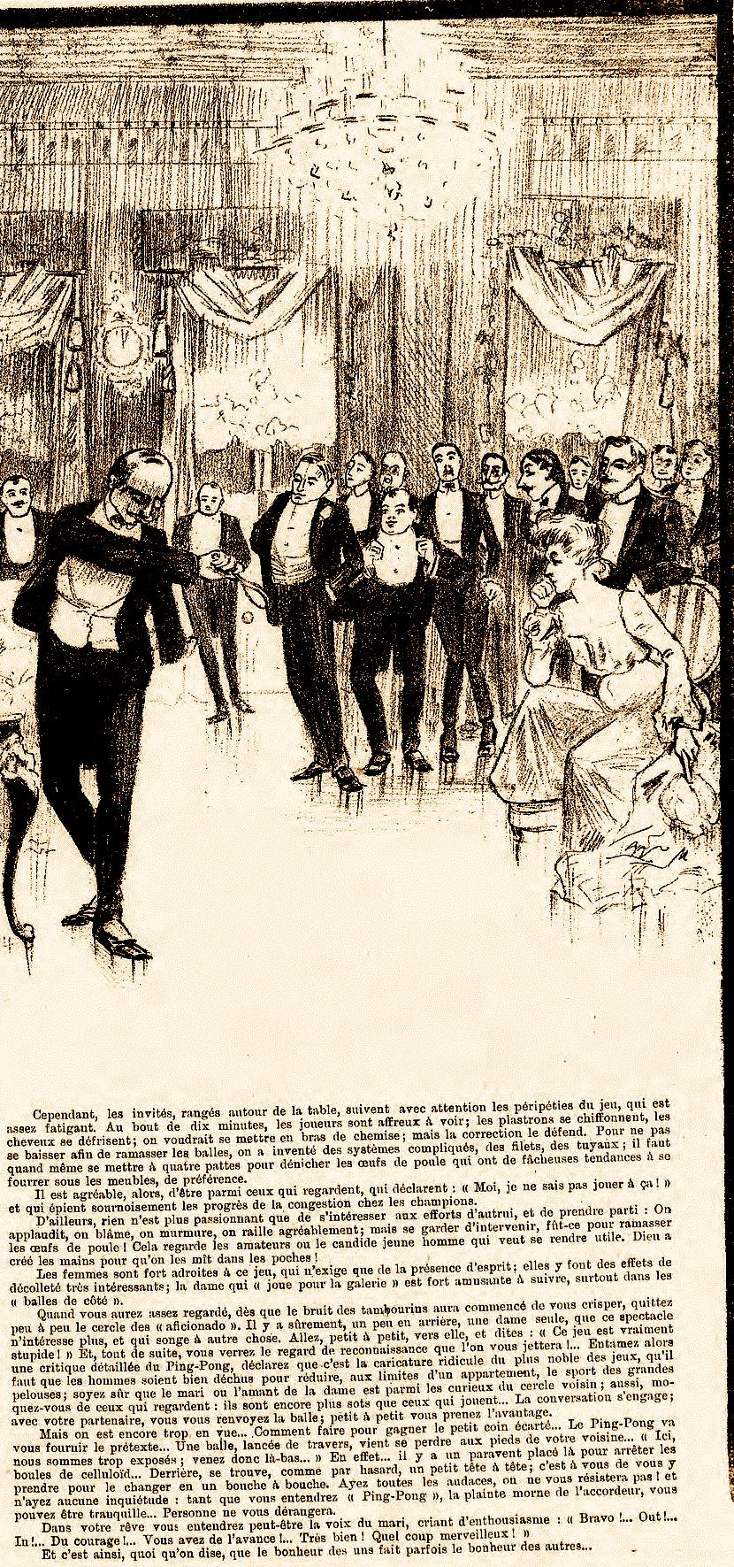 After dinner, quickly dispatched, we move into the living room, or rather the Ping-Pong room. And the session opens: Two partners grab the small rackets, a kind of tambourine mounted on a handle. It's very chic to have your own ping-pong racket, just as you had your own tennis racket. The players start sending the little celluloid balls back and forth over the net. Each time the ball hits the taut skin of the racket, it resounds with “Ping! Pong!” For the unfortunate neighbors trying to sleep, an evening of irritation begins, for the sound of “Ping! Pong!” brings to mind the monotonous, melancholy, tortuous wail of an out-of-tune piano. After an hour, it's enough to drive even the calmest of listeners mad.