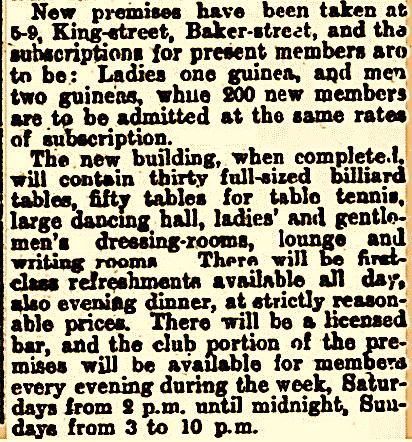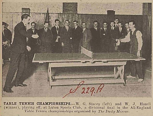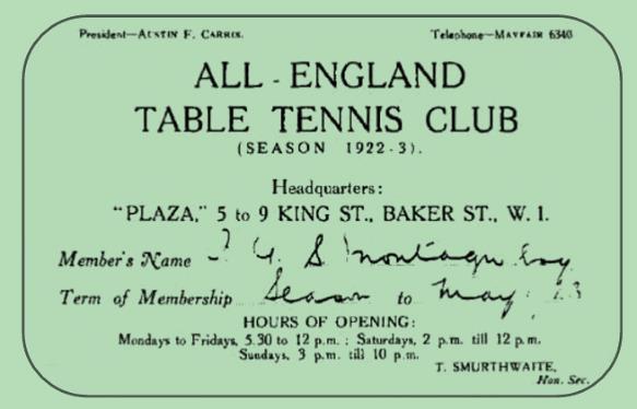 The tournament referenced in the letters started at 6:30 pm on Feb. 28 and went almost five hours, with 61 players, all men, on three tables (left). Winner was L.G. Cohen, who reportedly received tumultuous applause and a gold medal. Offensive skill was still underdeveloped in Guernsey three of the rallies in the final (a single game to 30) exceeded 150 strokes.