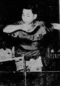 1958-59 Norikazu “Cannonball” Fujii of Japan, 33, joins Bergmann for Globetrotter tours of Europe and the U.S. Fujii is suspended by the Japanese association for being a paid professional, which by ITTF regulations means Bergmann must be suspended by the ETTA for playing with a suspended player, and he is. Fujii was the 1952 world doubles champion with Tadaki Hayashi and was Japanese champion four straight years, 1946-49 (seen at right in 1947).