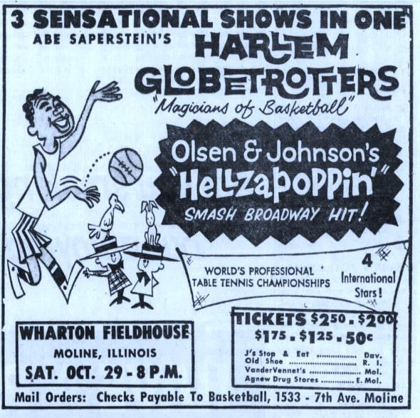 The Globetrotters originated in the 1920s. The 1930s and ‘40s saw the team tilt more and more towards tricks and comedy, though the halftime shows were still mainly skill demonstrations of basketball shooting. The comedy approach became especially important when the NBA finally began signing black players in 1950, gradually taking the best basketball prospects. The earliest table tennis halftime shows we found were in 1948. Besides table tennis, halftime soon also included acts such as acrobats, jugglers, singers, etc.