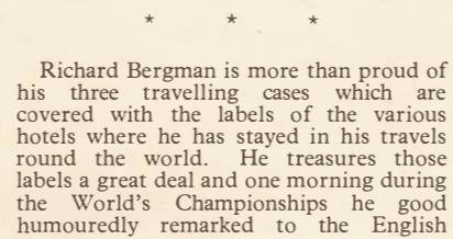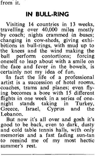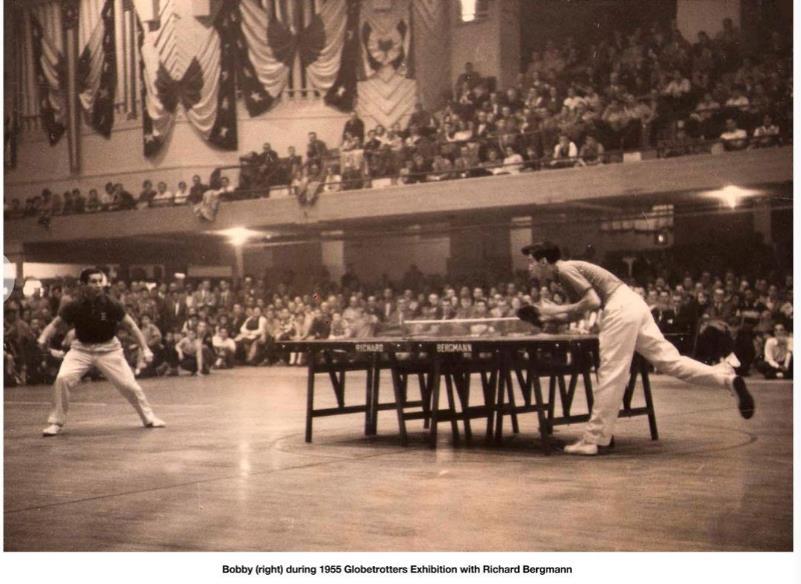 1954-55 Richard Bergmann, 36, joins the Globetrotters. He views the exhibitions as a great thing for table tennis and loves the travel see box at right from the Oct. 1956 English magazine Table Tennis and stays with them for the rest of his life, 15 years. Dick Miles, 29, is his first partner. They take a break in March 1955 for the U.S. Open, where Miles beats Bergmann 3-1 in the final.
