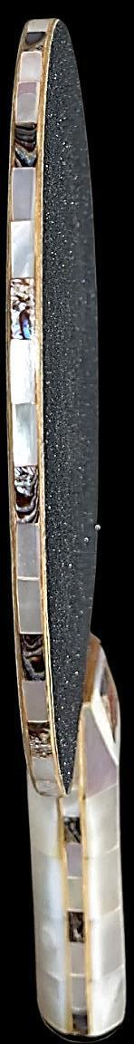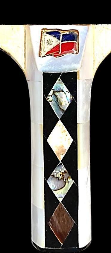Here is a good example of his artwork. Along with the Philippine flag, this museum-quality bat uses 86 pieces of nacre, better known as mother of pearl, the inner coating of mollusk shells.