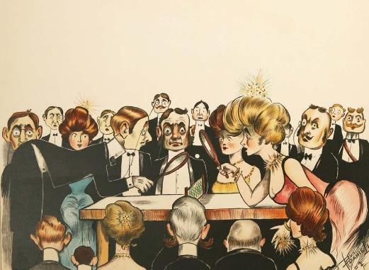 But the guests, arrayed around the table, carefully follow the game's progress, which is quite tiring. After ten minutes, the players look dreadful, their suits crumpled, their hair mussed. They are tempted to dress down to shirtsleeves, but correctness forbids it.