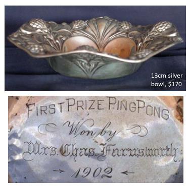 Issue 59 ***Page 14. Shows a silver bowl that appeared on eBay. Here is the story behind it: Mrs. Charles Farnsworth was 31-year-old Edith Winslow Farnsworth, married to an 1889 Brown grad who was in the gold-mining business up on Cripple Creek. She won this pretty bowl in the women’s Ping Pong competition at the Colorado Springs Town & Gown Golf Club, said the local Gazette, April 8, 1902. She and the men’s winner both used a leather-covered wood bat, “which seems to be the most effective kind for a fast and accurate game.” The “large and enthusiastic gallery impartially applauded the good strokes of both winners and losers.”