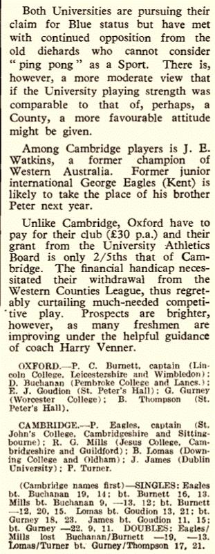 The Oxford/Cambridge rivalry continues today. Gurney won a half-blue, the top honor in his time. Today, Oxford awards discretionary full blue for men and half-blue for women. Cambridge considers table tennis basically a half-blue sport, but in 2023 they awarded one full blue, to a woman.