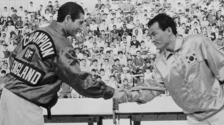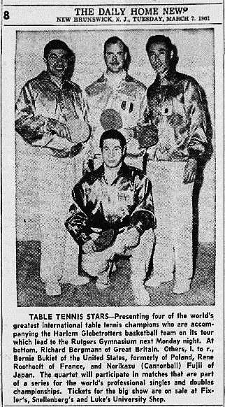 World-class players who traveled with the Trotters were, in chronological order, Doug Cartland of the U.S., Marty Reisman (U.S.), Dick Miles (U.S.), Richard Bergmann (England), Rene Roothooft (France), Norikazu Fujii (Japan), Bernie Bukiet (U.S.) and Dal-Joon Lee (South Korea). From 1948 through 1971, one or more of those eight stars performed with the Trotters every year. About two dozen other players were their partners or, as described in the pages after this article, traveled instead with the Globetrotter B or C teams. The Trotters never employed table tennis women, even though the one tennis star that traveled with them was the great Althea Gibson.