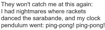 Once you've watched enough, and as soon as the sound of the tambourines starts to make you tense, leave the circle of aficionados. There's sure to be a lonely lady a little way back, no longer interested in the show, who's thinking about something else. Go, little by little, to her, and say: “This game is really stupid!" Right away, you'll see the look of recognition you get! Then start a detailed critique of Ping-Pong, declaring that it's a ridiculous caricature of the noblest of games, that men must be very fallen to reduce the sport of large lawns to the confines of an apartment.