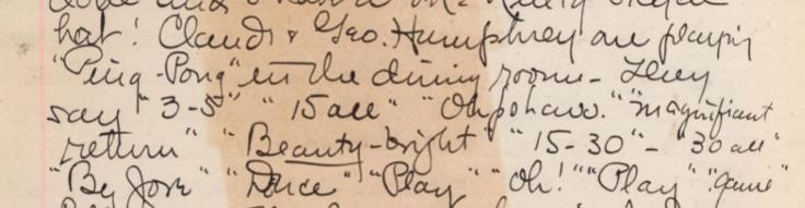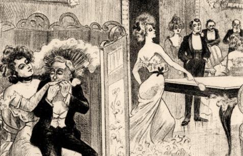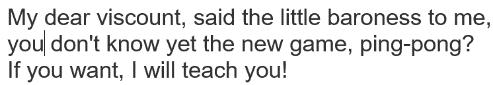 But we're still too far away... How to win the little corner... Ping-Pong will give you the pretext... A ball, hit the wrong way, gets lost at your neighbor's feet... “Here we're too exposed; come over there”... Indeed... there's a screen there to stop the celluloid balls... Behind it, as if by chance, there's a little tete-a-tete; it's up to you to change it into a mouth-to-mouth. Don't be afraid: as long as you can hear “Ping! Pong!,” the dull wail of the tuner, you can rest easy... No one will disturb you.