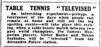 Issue 62 ***Page 6. Claims to show the “earliest evidence of Table Tennis broadcast on television,” February 16, 1937. But in Issue 66, page 10, we learn of an earlier broadcast at the same location, the BBC television studio at London’s Alexandra Palace. Noted in the final entry of the November 12, 1936, schedule at left, this was a ten-minute exhibition by the Hungarians Barna, Szabados and Bellak, with W.J. Pope as referee. All four men had their faces and hands “yellow ochred” to offset image distortions. (The following dayps and weeks saw radio coverage of the England vs. Hungary exhibition tour, such as a 20-minute commentary by D.W. Miller during play at Memorial Hall, London.)