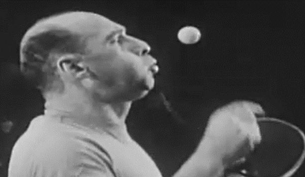 1956-57 Roothooft breaks his foot in a car accident and is replaced by Bernie Bukiet (below), 37, a U.S. team member originally from Poland. Exhibitions didn’t hurt Bukiet’s game either, it seems the old man won his first U.S. singles title in 1957 and then two more in 1963 and 1966.