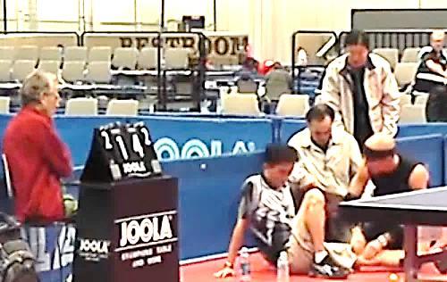 “But Ken started the fifth game strong and was leading 4-0. Suddenly, though, his left leg cramped up. He had played tough matches to get to this point, and now his body was rebelling. After trying one more point, he was still in pain, and Adoni suggested they take a break. Ken sat on the floor while friends tended to him. Adoni himself massaged the leg, and they wrapped it. Ken thought he could resume playing, though I worried his leg might cramp again, or he might play very tentatively.