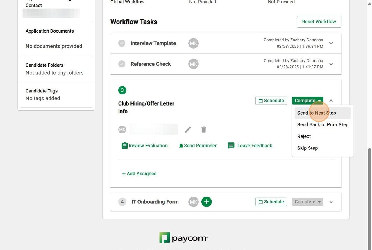 IfyouwouldliketousetheInterviewTemplateduring(orshortlyafter)the interviewwiththiscandidate,click"StartEvaluation"understep1(ifyoudonot wishtousethisInterviewTemplate,click"Complete>SendtoNextStep"tomove tostep2,ReferenceChecks).*Pleasenote:step1oftheWorkflowTasksis optional.Steps2&3arerequired
