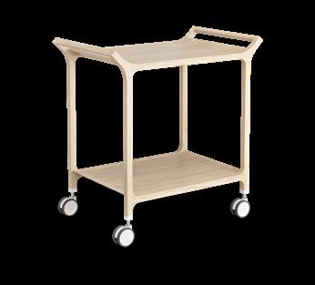 Tray and frame are available in three versions: natural lacquered ash, white lasered ash or black lasered ash. Different combinations of trays/ frames are possible. Trolleys with white lasared or natural lacquered trays are delivered with white wheels, trolleys with black lasered trays are delivered with black wheels. The upper tray can be lifted off.
