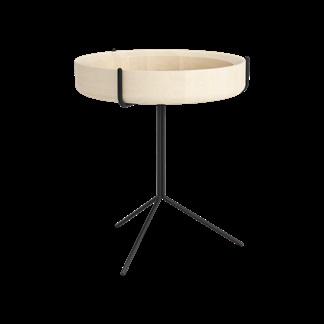 Side table with top in natural lacquered ash or oak and white laminate. Wooden sleeve in ash. Base and post in Ral 9007.