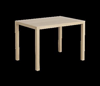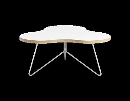 Table in white laminate with oak or birch edging. Steel stand in white or chrome.