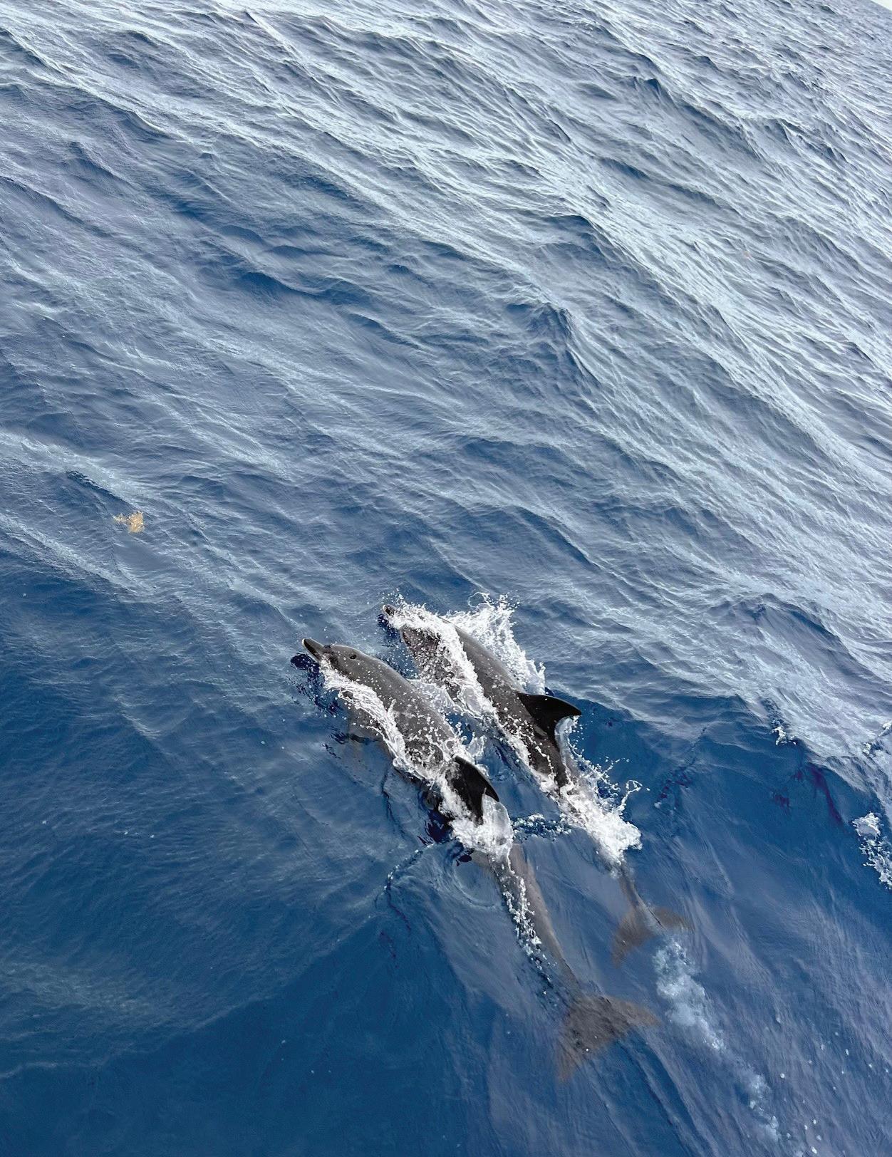 During the night shifts, we take turns steering and keeping lookout for ships and wildlife. One night, I’m sitting at the bow of the ship when suddenly glowing dolphins, lit up by the electric hue of bioluminescence, begin to swim next to the ship. Scientifically speaking, bioluminescence is the production and emission of light by living organisms. It is caused by blooms of the algae Lingulodinium Polyedra. Spiritually speaking, it is both mesmerizing and awe-inspiring. At night, when the phytoplankton are moved by waves or creatures in the water, the blooms begin to glow in vivid, neon hues. Dancing shadows of light beneath the surface, the dolphins look like ghosts of the ocean.