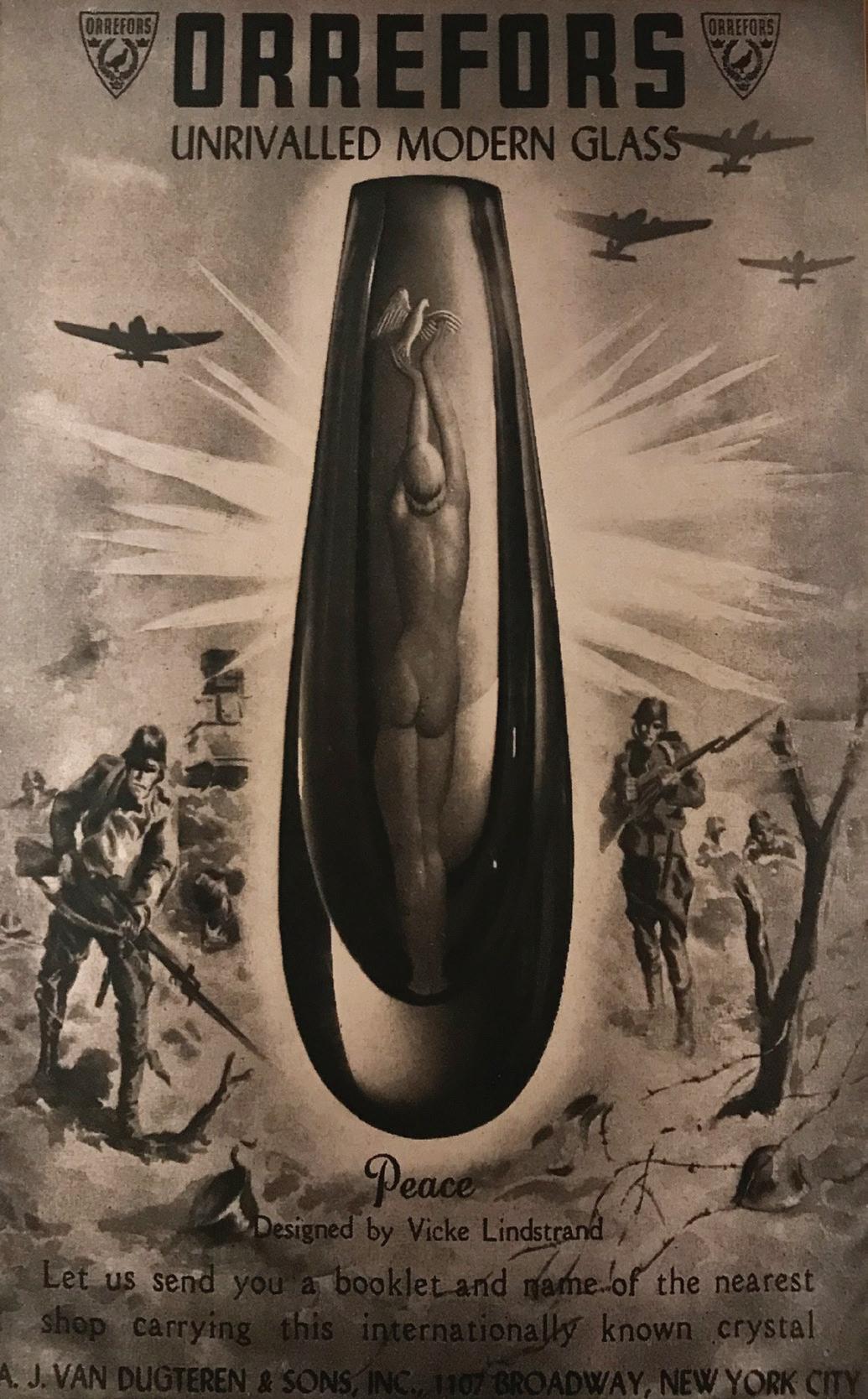 This ad, produced in 1944 by Nordiska Kompaniet (NK), features the “Shark Diver” vase, designed by Vicke Lindstrand. This Orrefors advertisement, produced between 1941 and 1945, features Lindstrand’s “Peace” vase surrounded by soldiers of World War II.Glasriket , or the Kingdom of Crystal, is a geographical area in the southern Swedish province of Småland, where glass has been blown by mouth since 1742. The region offers a plethora of unique glass-related experiences – including swimming and sleeping surrounded by glass.