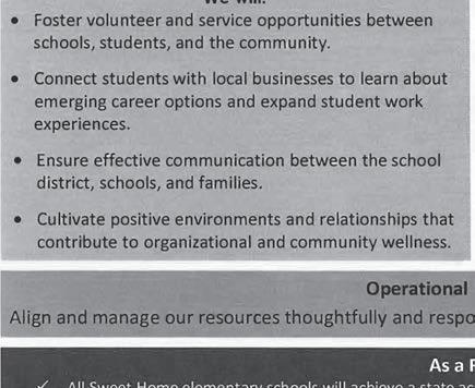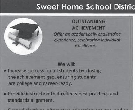 As Superintendent, my areas of focus are aligned with our Sweet Home Strategic Plan. We have extended the well-developed 5-year plan for two more years. The most immediate area to focus on is increasing student achievement as priority number one.