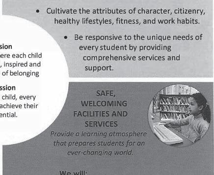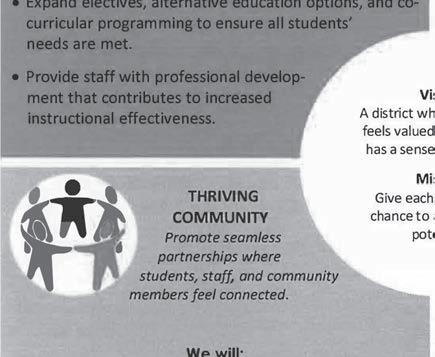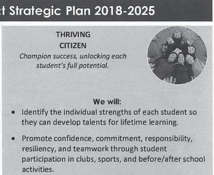 Priority Three, Thriving Community: School culture and pride took a huge hit during Covid. The best way to prepare our students to become productive citizens is to teach them the story of our country and get them grounded in the e ort and ethic that has made our country, state, and community the success that it is today, We can only succeed to the degree that we care for one another, and are good stewards of our natural resources, and work together. In our schools and community, we want to reinvigorate our volunteer and service opportunities between schools, students, and the community and we want to re-connect students with local businesses to learn about emerging career options and expand student work experiences.