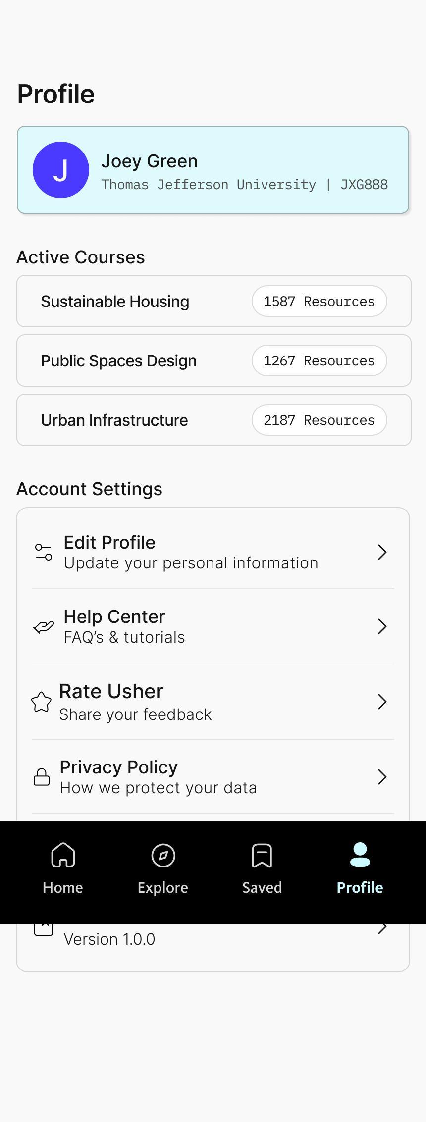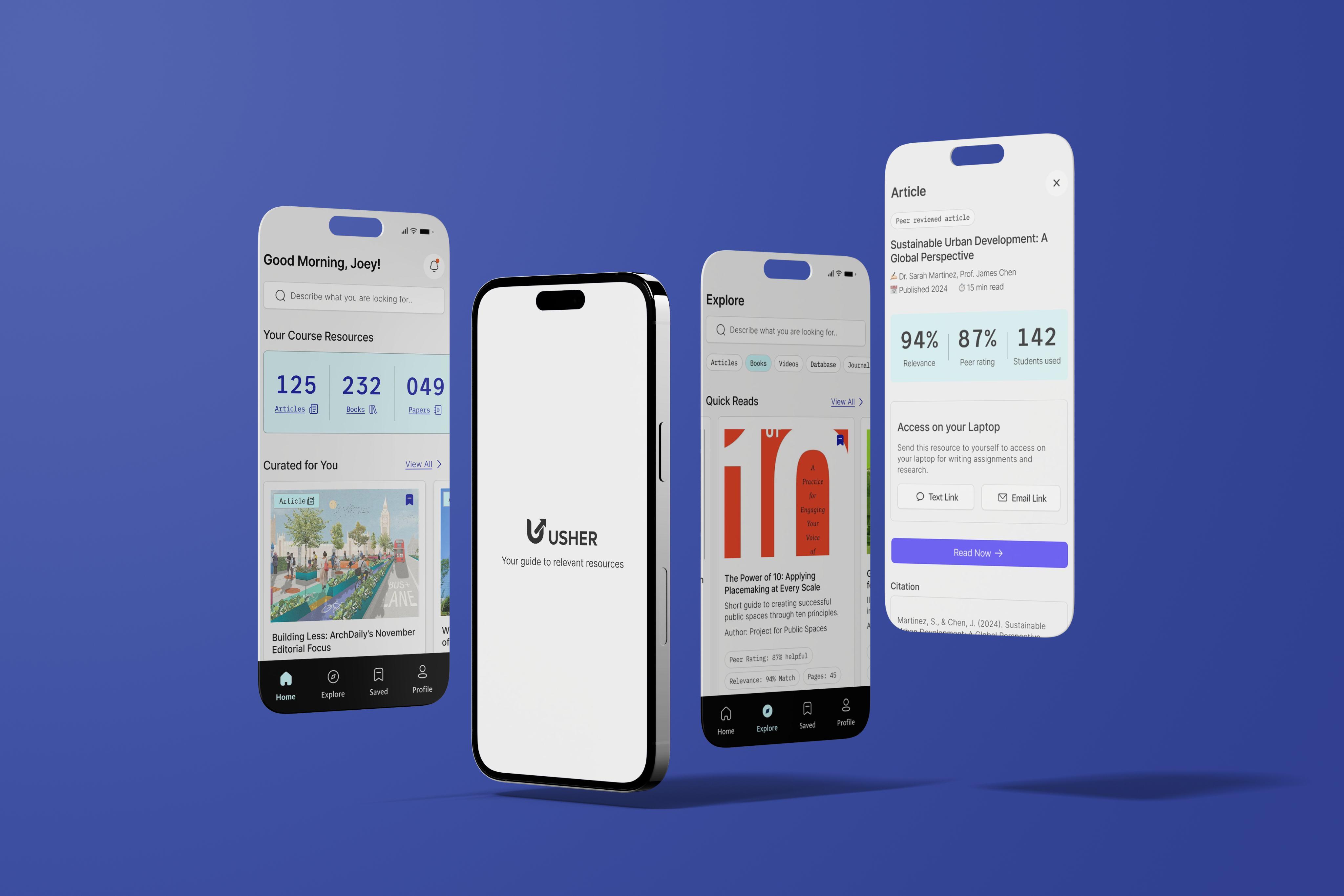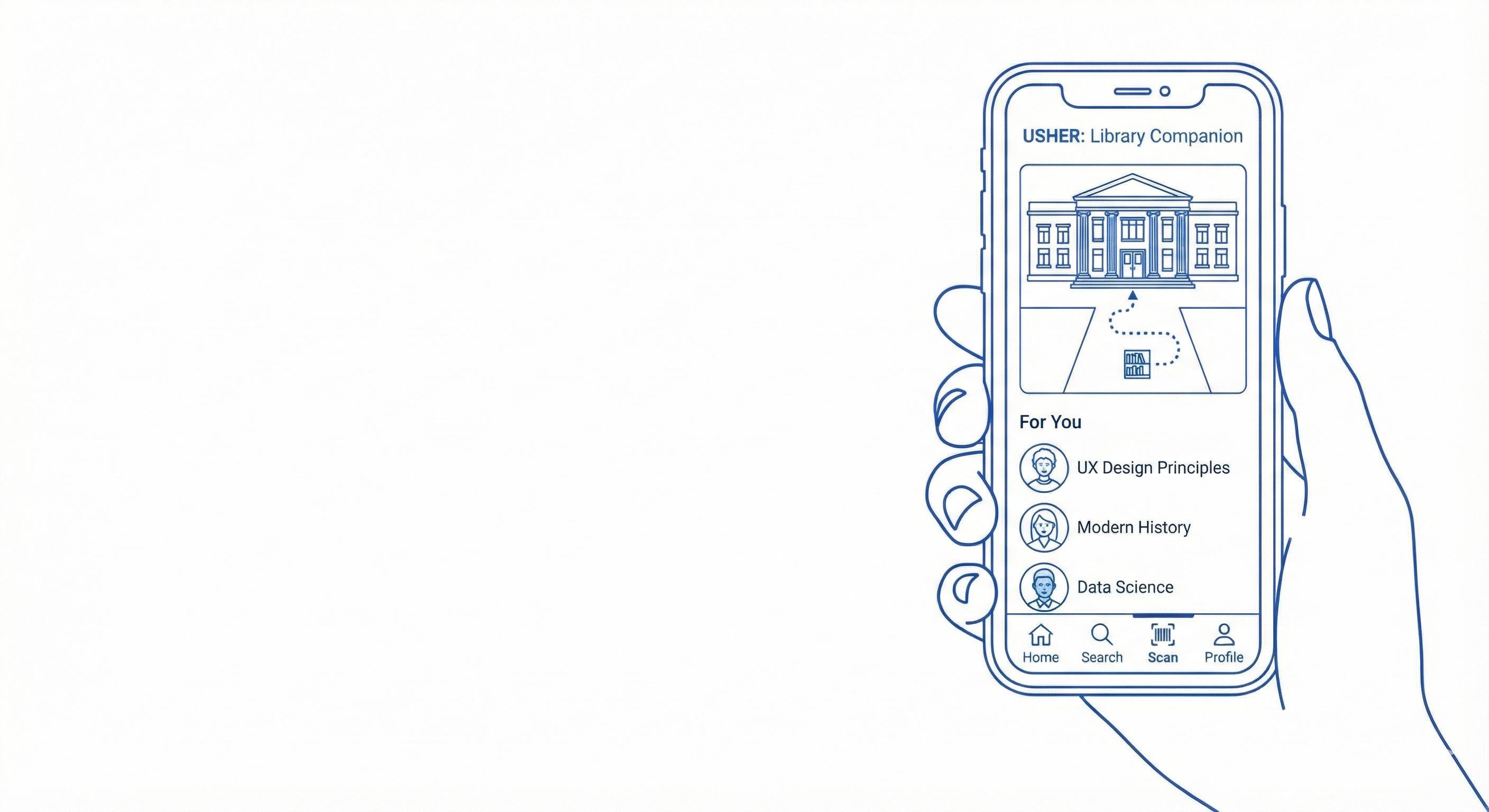 Usher, an AI-enabled mobile concept, aims to bridge this gap by analyzing assignments through Canvas API integration and matching students with personalized library resources. This thesis documents the complete UX process, from research synthesis to prototyping and pretotyping, demonstrating how thoughtful design can improve academic resource discovery and build trust in institutional tools.