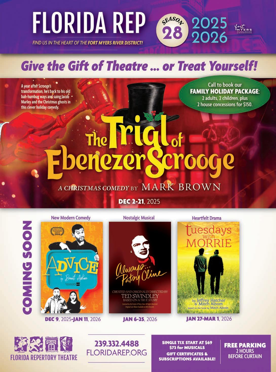 “Theplayisawonderfulholidaytreat fortheentirefamily,”saysGreg Longenhagen,FloridaRep’sproducing artisticdirectorandthedirectorofThe TrialofEbenezerScrooge.“Thestoryis filledwithgentlelifelessons,holiday mirth,andplentyofcomedy.OurtalentedcastbringtheclassicDickens’characterstolifewithbothdepthandflair–allforthedelightofthe audience.”