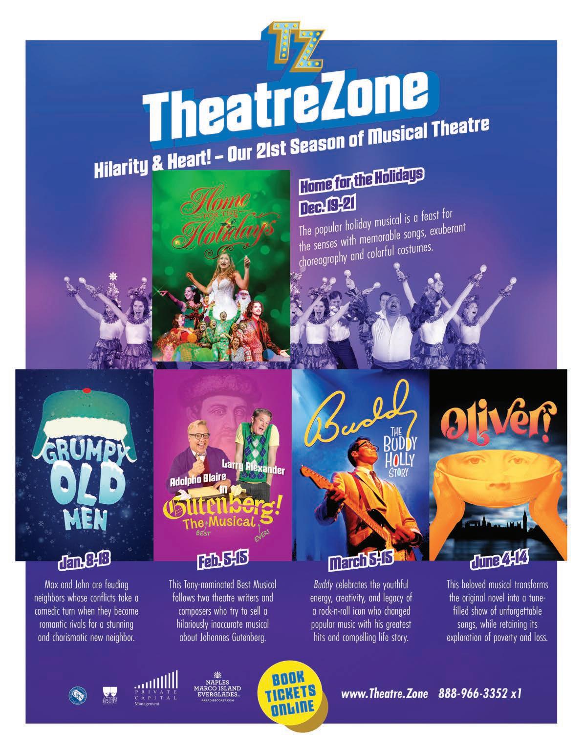 TheatreZone,celebratingits21stseasonin20252026,performsitsmusical productionsintheintimate 250-seatG<heatreconvenientlylocatedinNaples at13275LivingstonRoad, betweenPineRidgeand VanderbiltBeachroads,in adedicatedbuildingnestled withinthecampusofthe CommunitySchoolof Naples.