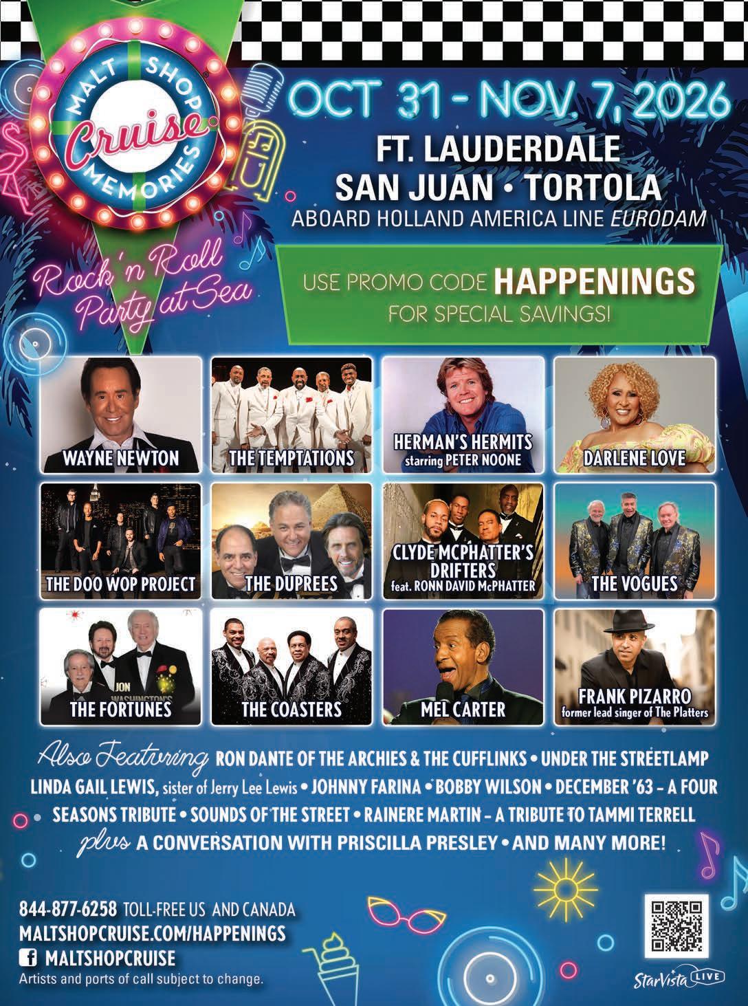 The2026sailingofMaltShop MemoriesCruisewentonsaletothe publicNov.20.Thelineupfornext NovemberincludesWayneNewton, TheTemptations,Herman’sHermits starringPeterNoone,DarleneLove, TheDooWopProjectandmany more.Thiswillbethe16thanniversaryofthiscruise,andlikeinyears past,itwillselloutsoonerthanlater.