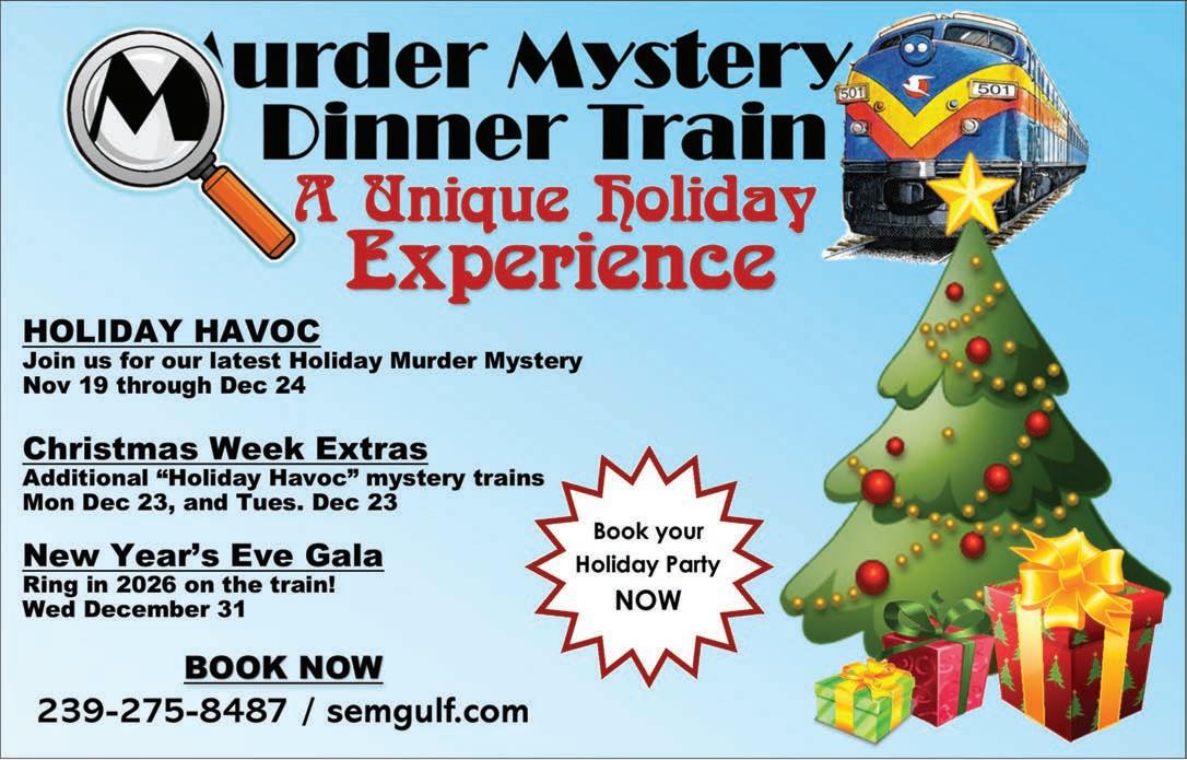 HolidayHavocplaysnowthrough Dec.24onSeminoleGulfRailway’s MurderMysteryTraininFortMyers.