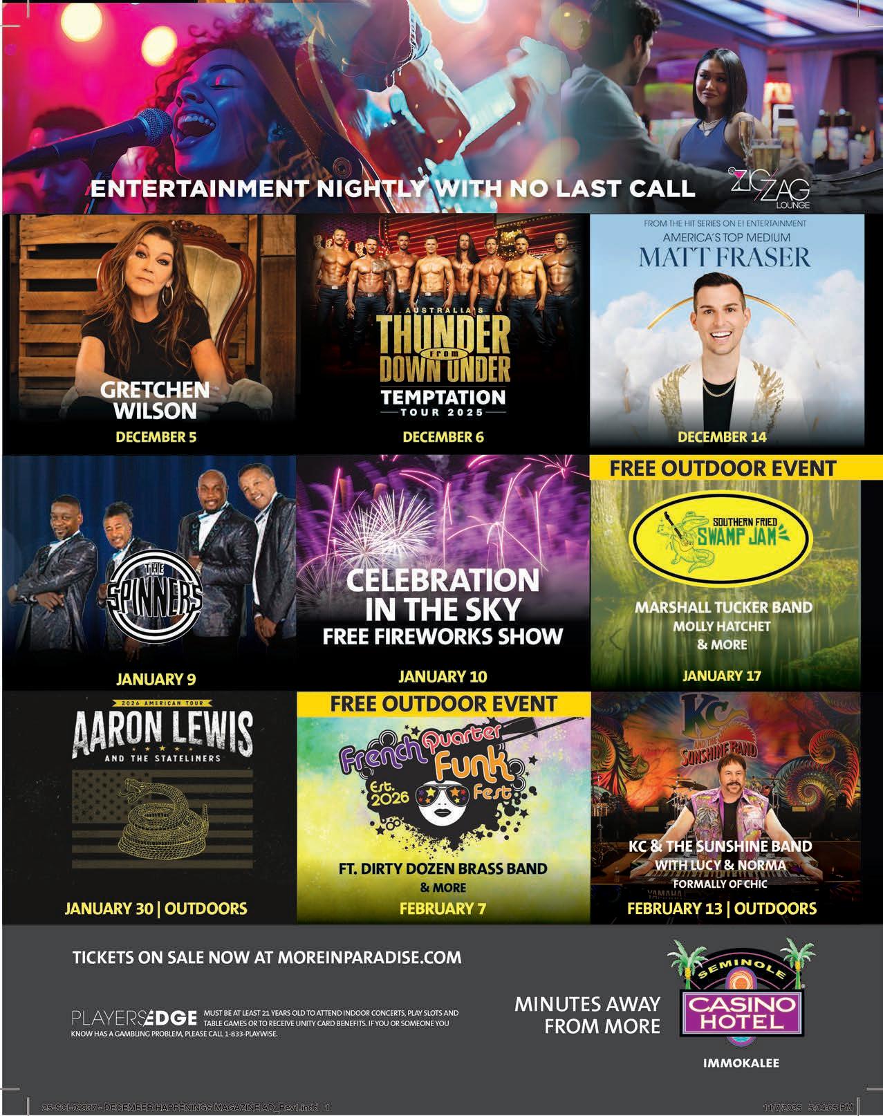SetagainsttheCaloosahatcheeRiver backdrop,thenewseasonblendsnationaltouringacts,culturalshowcases,and communitycelebrationsthatreflectthe amphitheater’sgrowingreputationas SouthwestFlorida’shubforliveentertainmentandsharedexperiences.