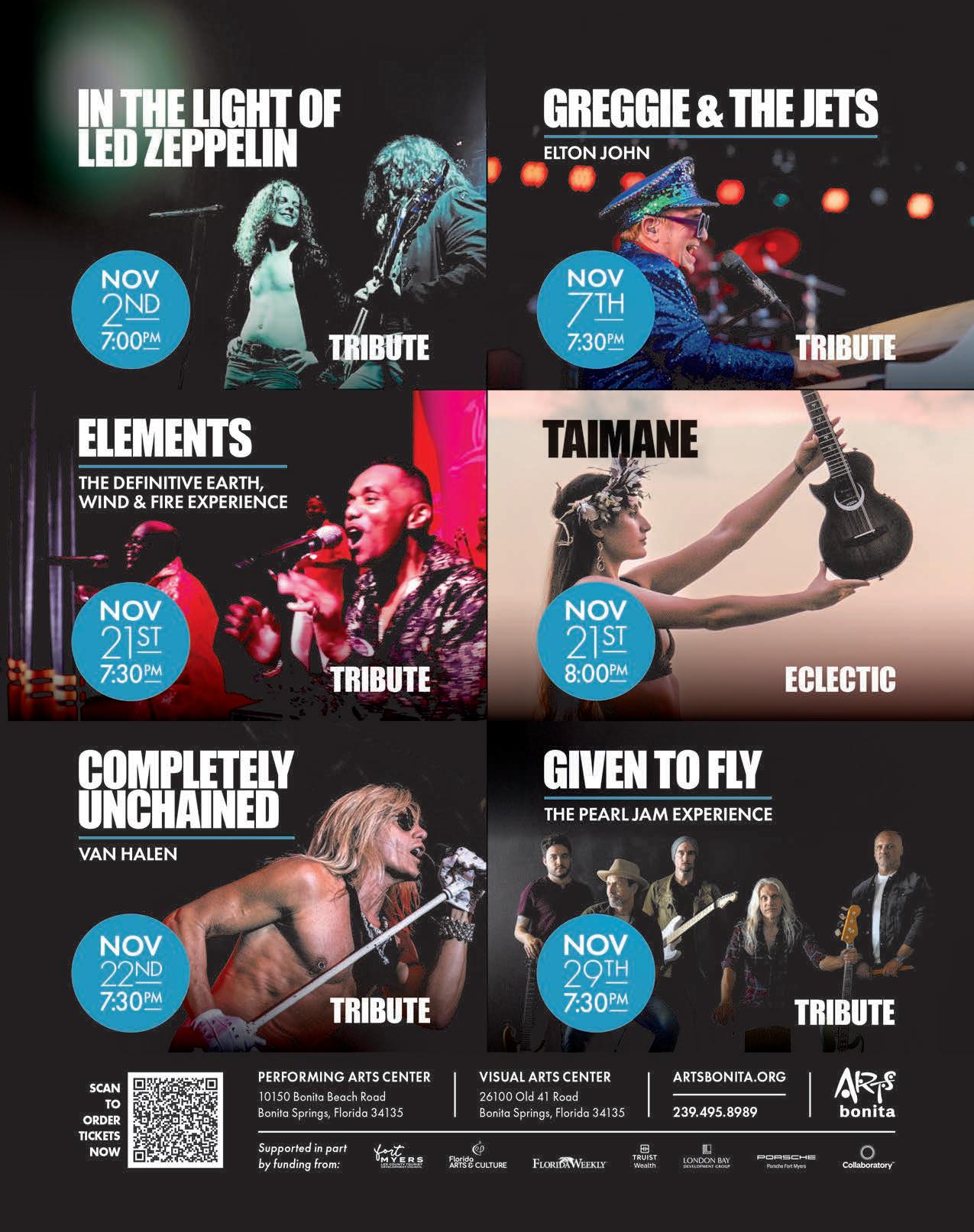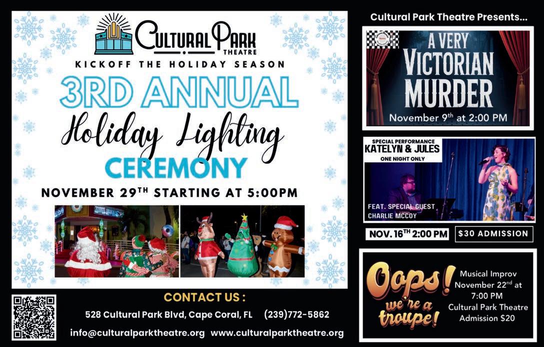 InCapeCoral,CulturalPark Theatreishostingseveralevents includingauditions,concert,cabaret, comediansandaChristmaslighting
