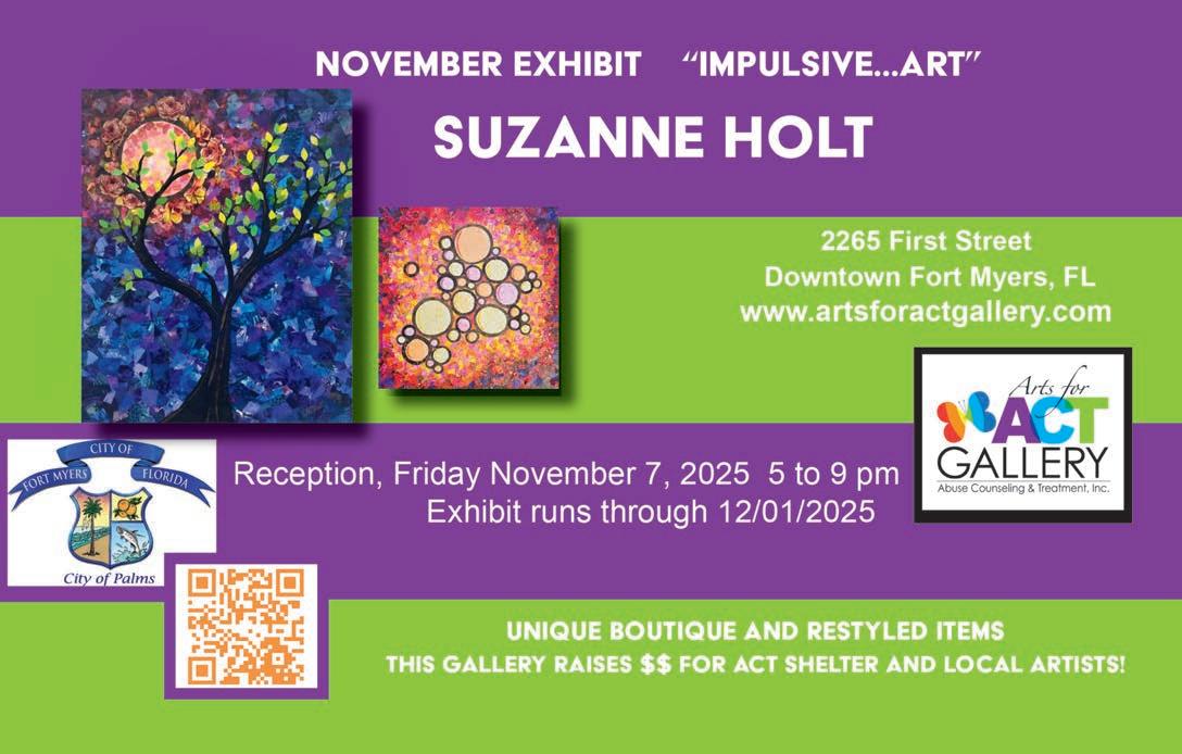 Formorethanfourdecades,ACThasprovidedcritical, life-savingservicesforvictimsofdomesticviolence,sexualassault,andhumantraffickingthroughoutLee,Hendry andGladescounties.AllproceedsfromArtsforACT directlysupportACT’smissionofprotecting,sheltering, andempoweringsurvivorsandtheirchildren.