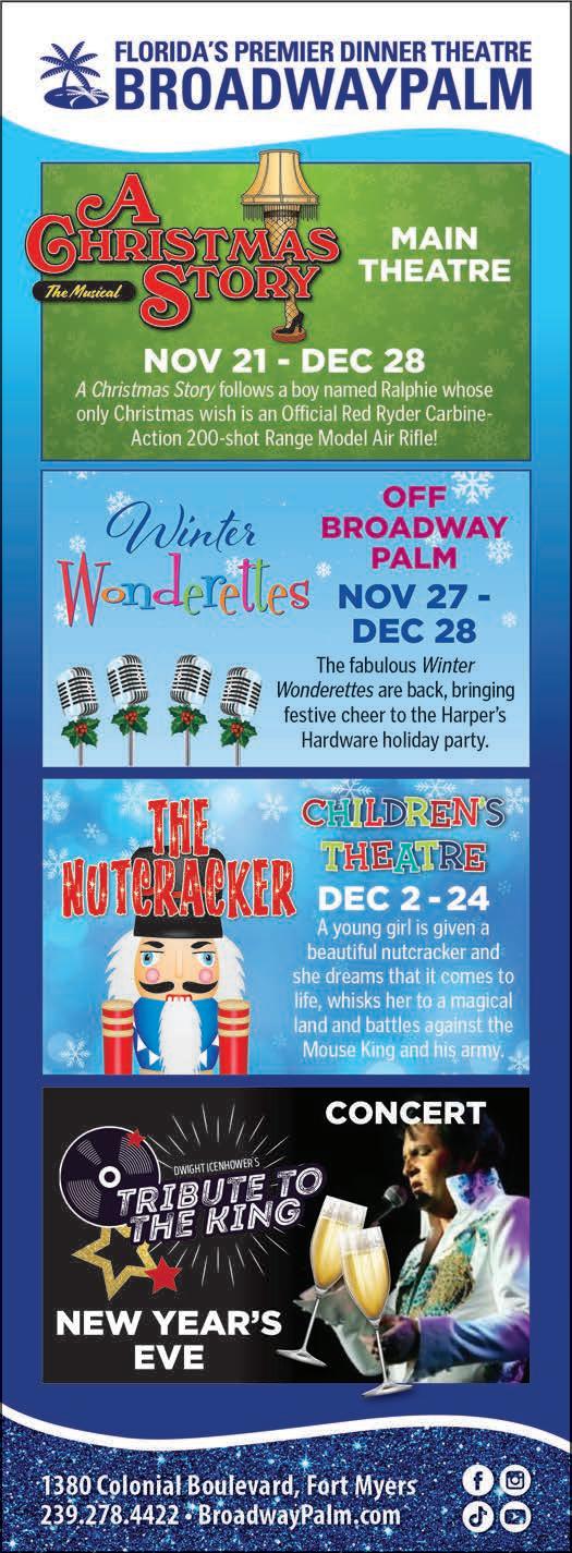BroadwayPalmDinnerTheatre presentsPrettyWomanthemusical nowthroughNov.15inFortMyers. ThatwillbefollowedbyAChristmas StorythemusicalwhichopensNov. 21andrunsthroughDec.28.