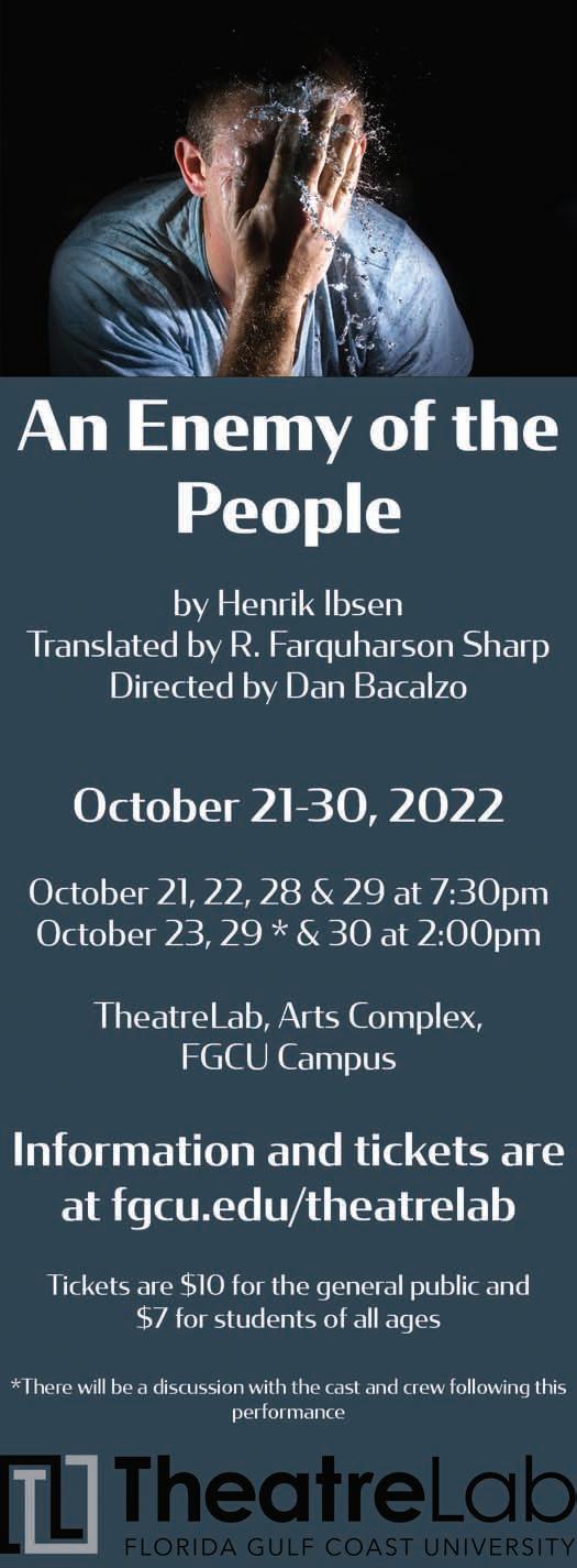 TheBower SchoolofMusic& theArtsatFlorida GulfCoast University’s TheatreProgram willpresentAn Enemyofthe Peoplewrittenby HenrikIbsenand directedbytheatre professorDan Bacalzoin TheatreLabinthe ArtsComplexatFGCUin FortMyersfromOct.2130.