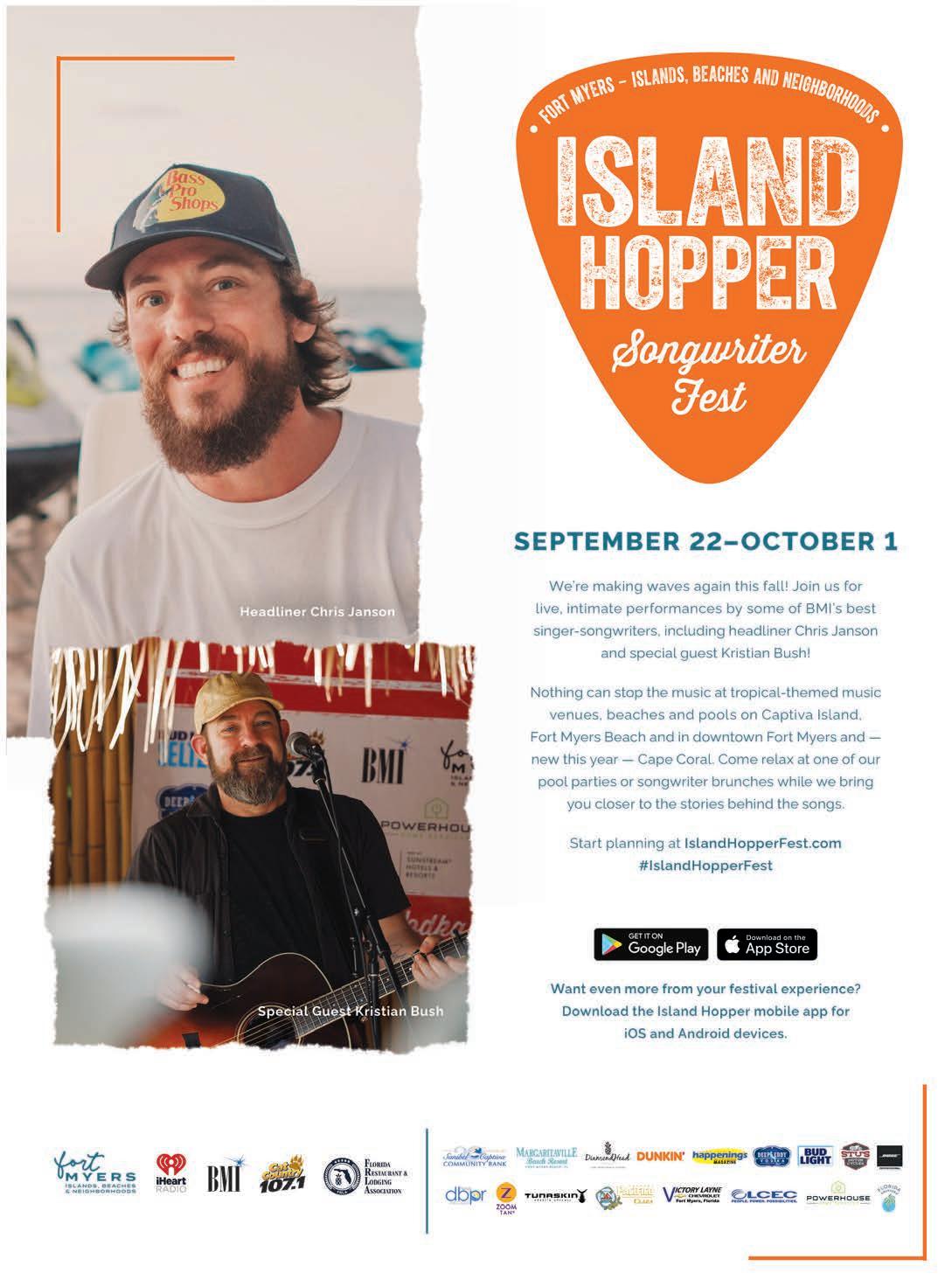 TheannualIslandHopperSongwriterFestivalcomes todowntownFortMyersSept.27&28andfeatures numerouslocalandnationalsongwritersatfivedifferent venues.Findtheentire10-dayfestivalscheduleat www.islandhopperfest.comorsimplydownloadtheapp.
