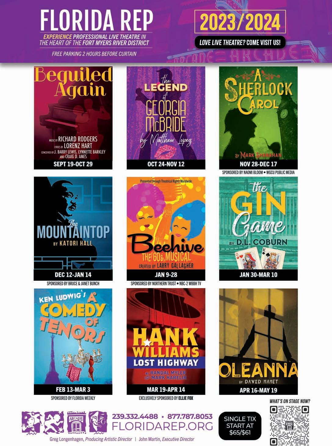 It’stimeagainforourannualtheatre seasonpreviewissueofthemagazine. Inthe2023-24season,therearenearly 120differentproductionsat19different venuesinSouthwestFlorida.Wehave alreadystartedanotherwonderfulseasonoftheatreandwehavesomany choices...again.Withoutanyfurther chatter,let’sseewhatis onstagethisseason.
